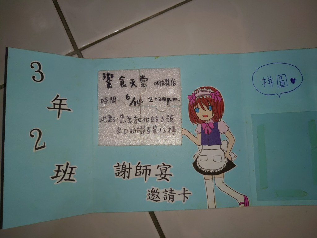 兩周前,收到謝師宴的邀請卡,也是非常特別,還得完成拼圖才知道地點。縱使,那天我有課,不過,為了回應你們的熱情,我會盡力趕過去,好好地和你們再次相聚。