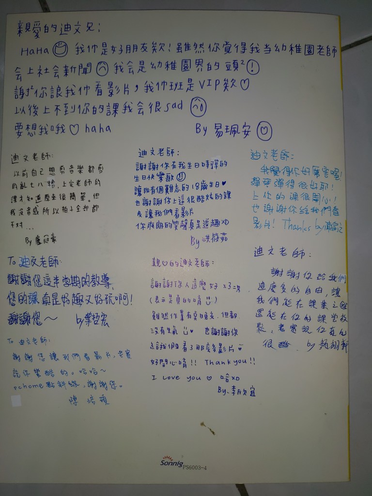 這學期臨時被指派代課,而與你們結緣,在我授課的那麼多班級中,(除了315音樂班以外,315是因為在一年級進來時,就已經上過我的課,而且,他們和我的互動比普通班要頻繁。)你們是最可愛的一群,而且,非常有創意,全班同學都非常有禮貌,也很團結。雖然只有一學期的時間,但是我們的距離並不遠。
