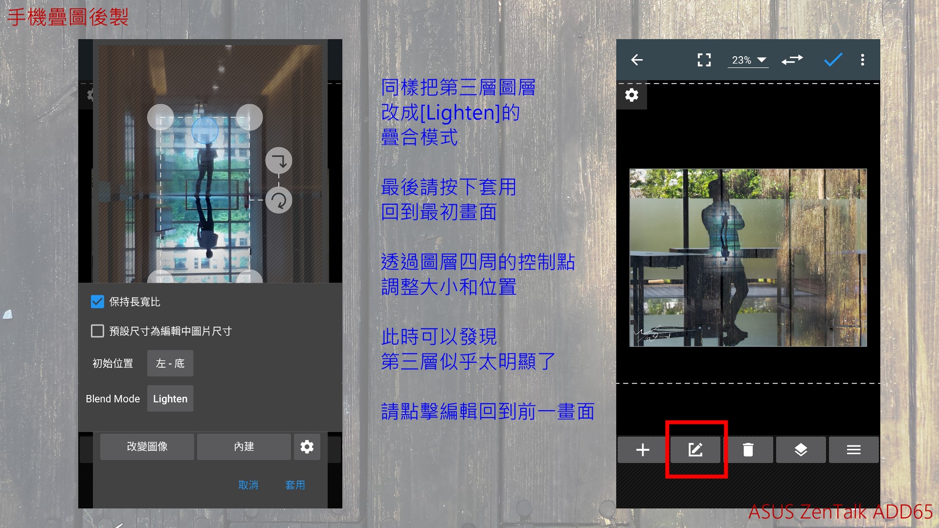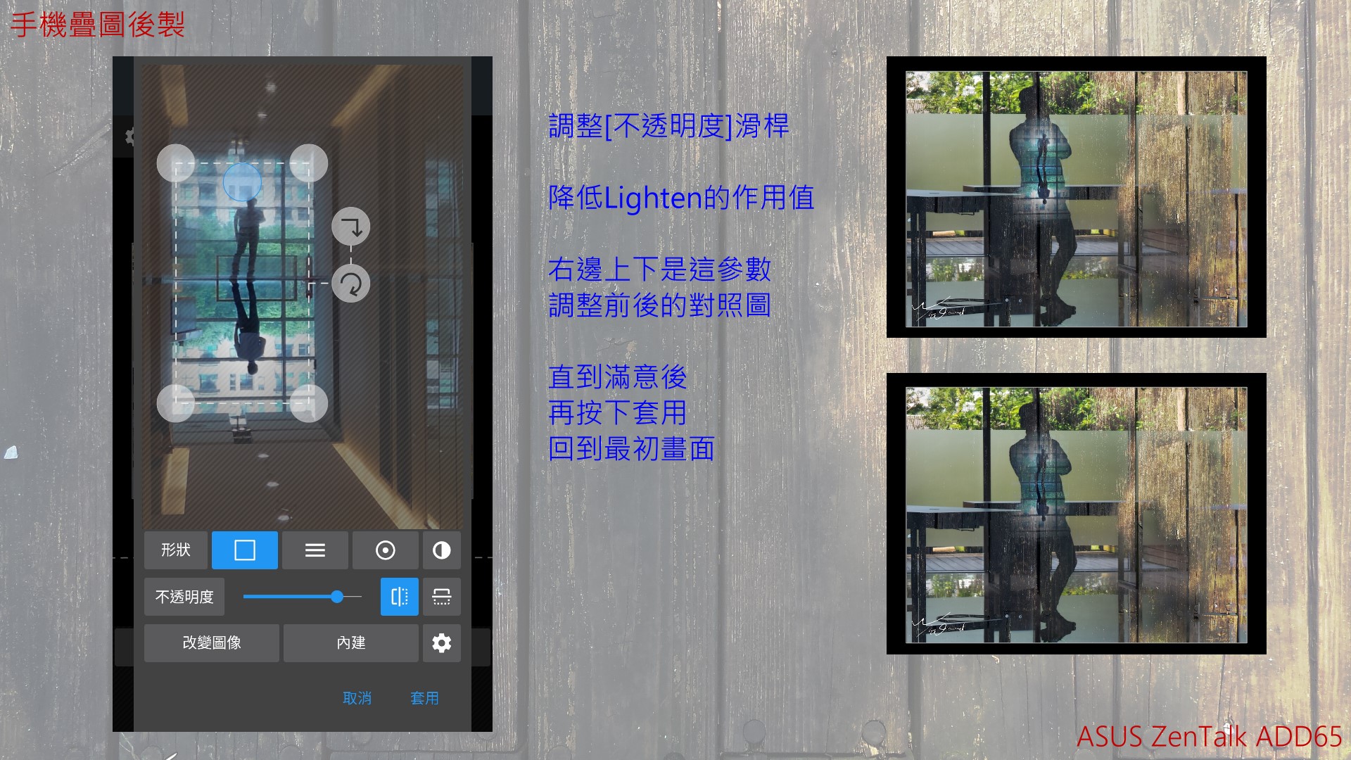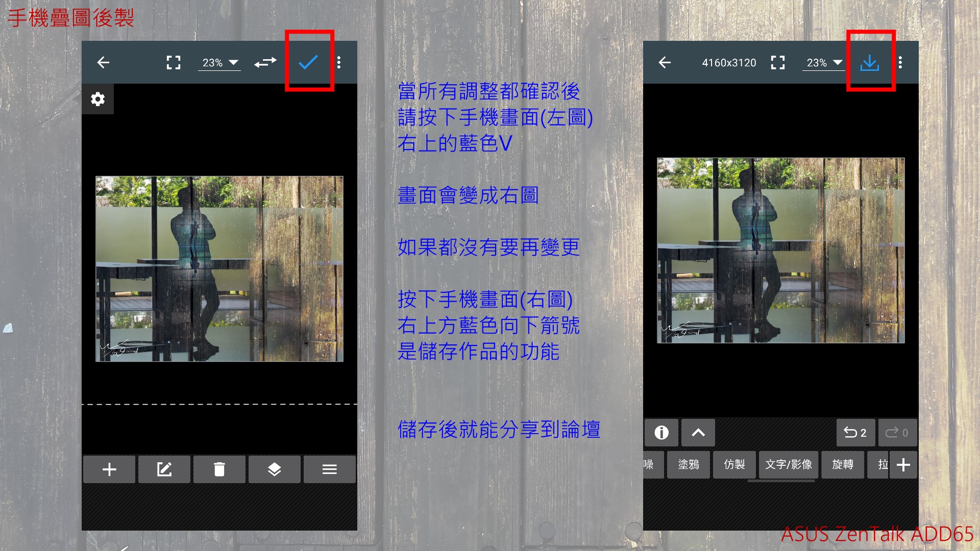 疊圖不難,用手機的APP更容易,只要花點心思和時間,人人都可以做到。我慣用的APP名稱是相片編輯器-Photo Editor[註],可以在APP市集中找到,目前是免費提供各項功能,而且持續更新APP,7年時間都維持在主要的手機照片編輯APP,各位可以試試。