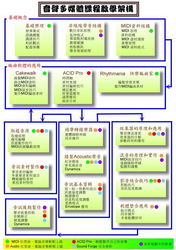 【後記】主圖的課程規劃,是依據下圖在2002年整合完成的影音課程調整而成。以實務性為導向,將生硬的技術轉化成無形的應用,併合筆者編寫的著作,分列在各細項課程中,供學生參考。