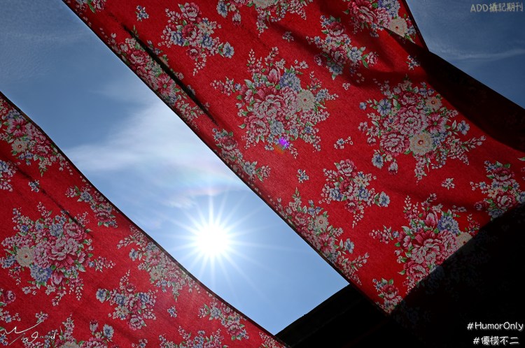 最後,來一張驚艷之作,2020年7月中,客戶指定在蘆洲李宅拍攝小朋友抓周活動,在排隊等候時,上方有拉著兩條紅花布遮陽,太陽從中間穿透照在我臉上,拿起相機就拍下這張星芒照片。這一張是用35mm定焦鏡拍攝,光圈最小就是F/16,ISO-100,1/800秒。