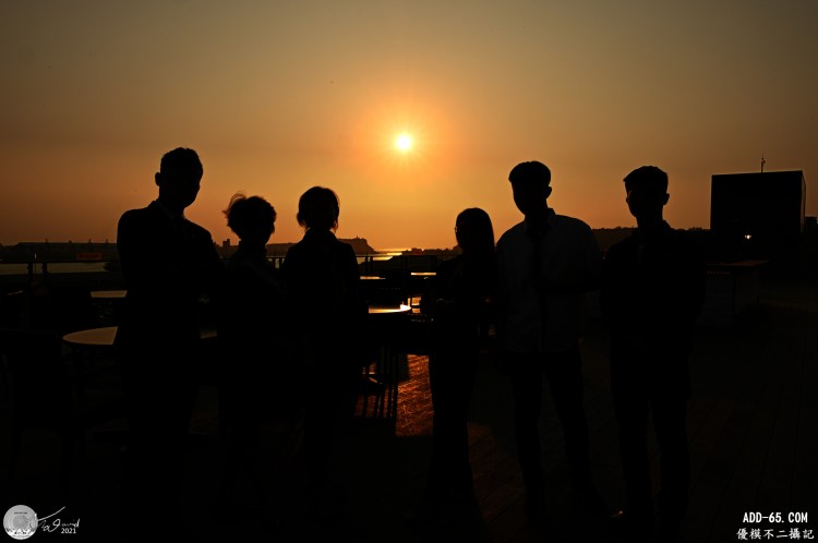 拍攝這類風格照片,適合在下午三點過後,陽光強度開始減弱之外,在天空的位置也開始下降到適合取景時入鏡的位置。下圖是同一天在下午五點半,客戶上頂樓拍完團體照片後,分批拍攝夕陽的剪影照片,和前兩張相比較,可以感受到陽光強度更弱,而且色溫也開始往下降低,色調呈現橘紅色系。當日太陽降到接近海平面時雲霧變厚,呈現星芒的感覺和前兩張不同,整體風格變得很暖的回憶氣氛。ISO-100,F/22,1/100秒。