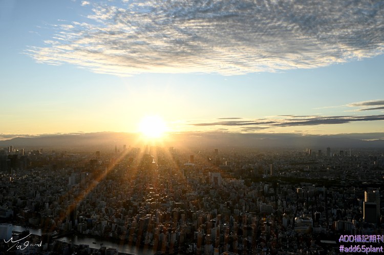 再來一張也是用Kit鏡拍攝,2019年10月在東京晴空塔上層拍攝的夕陽照,ISO-100,F/22,1/20秒,地面建築間隙明暗對比下,加上天空那一片雲,有種星際爭霸戰的感覺。如果接近地平線沒有雲層,可以等到太陽落入地平線大約三分之一時,可以拍到更棒的畫面。這種大景照片,只能靠運氣囉!