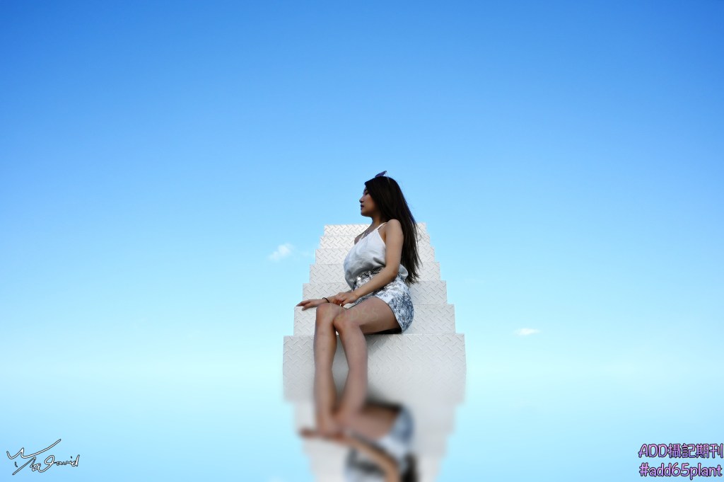 下圖是2019年七月底在宜蘭A-Maze兔子餐廳拍攝天梯人像,這一張(ISO-400,F/4,1/3200秒,EV+0.7)將一方加了一點鏡射和糊焦,也是創造出飄浮在水面上的感覺,把MD腳由小腿部份開始進入水中,產生輕鬆感覺,表情就像在微風下享受著清涼空氣般。