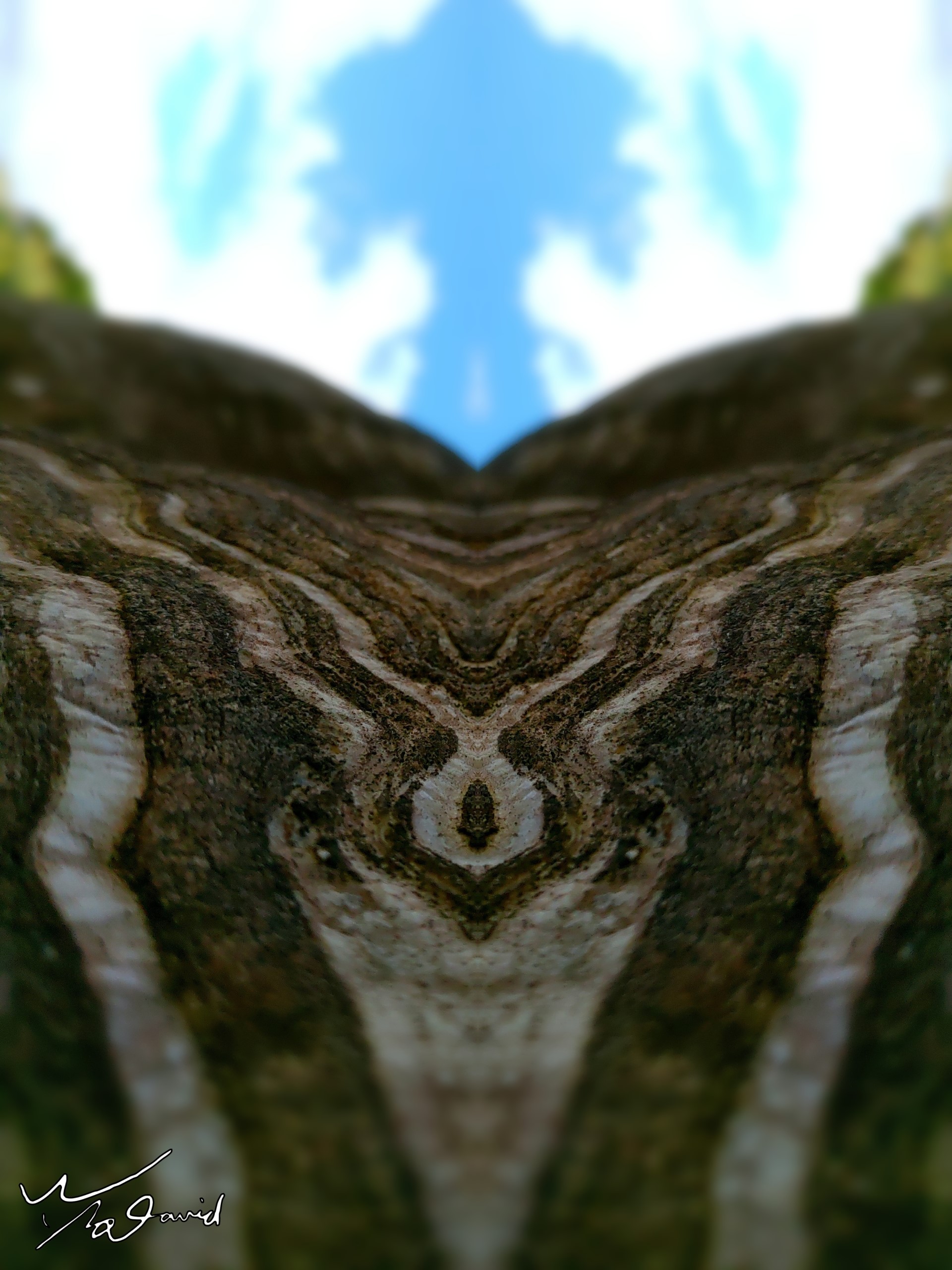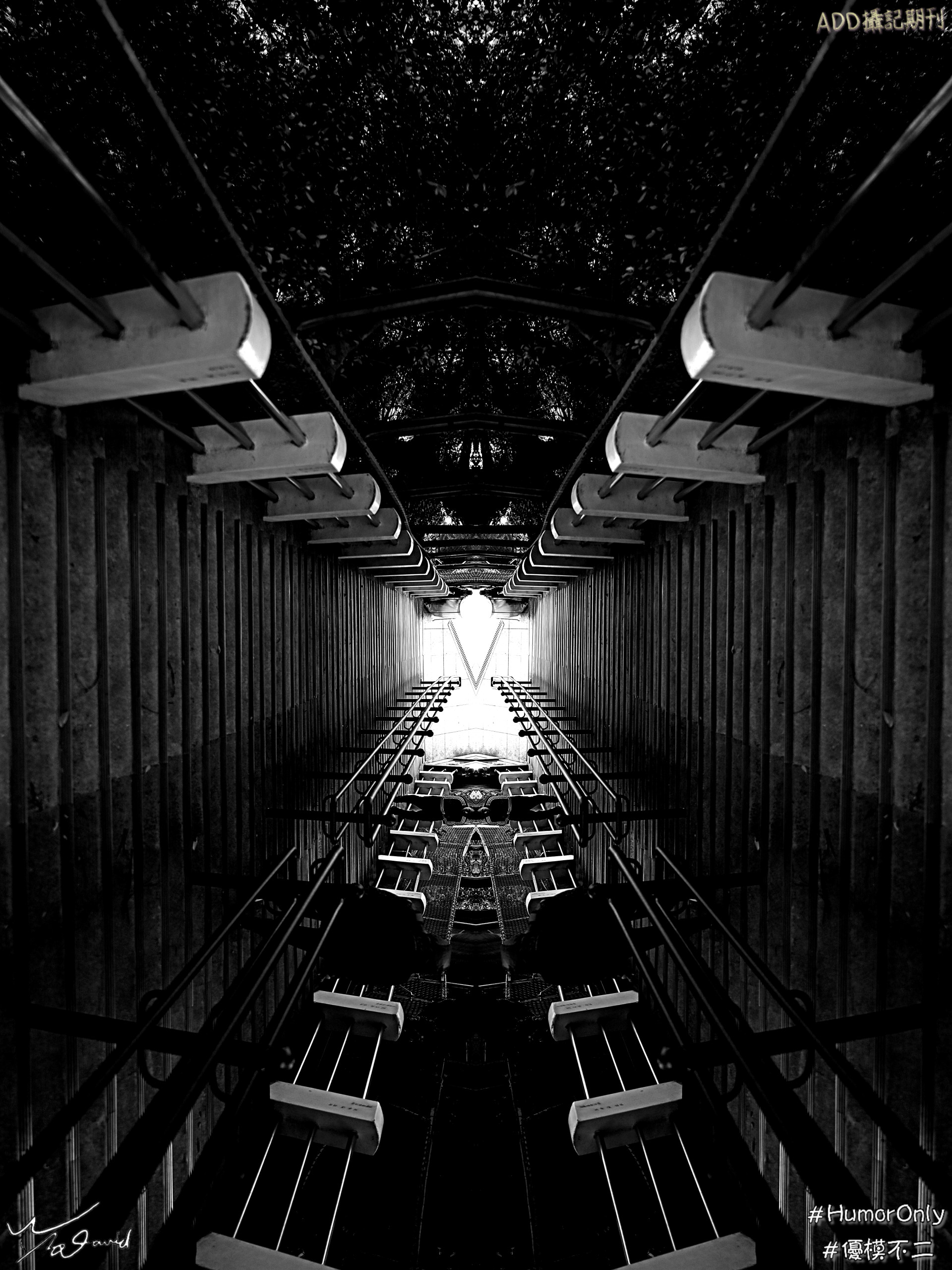 由下面的例子可以看到鏡射後的特殊圖騰,和原圖的感受完全不同。是在於想像力和創意相輔相成之下的結果。我們再來看看六張作品作鏡射應用,同樣分成上下兩排照片,上排的左側兩圖,也是單純對半左右鏡射而已,特別是中文字【中山】兩個字,左右鏡射後,字面外形沒變,一樣可以看出是什麼字,但對又能左右對稱,這是中文字的好玩之處。上排右側照片,原本是中和四號公園裡的一顆巨石,用手機拍攝其中一部分,左右鏡射後,把上下部分糊焦處理,形成中間很特殊的圖騰,像是一隻無腳的蜘蛛。下排左圖是在桃園X-Park園區內拍攝霓虹燈管,左右鏡射後再上下倒置。下排中間黑白照片,是在中和烘爐地拍攝樓梯,轉動九十度後左右鏡射,再改成黑白照片,形成時空隧道的感覺。下排右側照片的原圖,是在台南安平碼頭拍攝幾片厚玻璃,先用水波紋特效處理,讓原本平整的線條變成波浪狀,再用對半鏡射後改成黑白照片,很像地圖上等高線的樣式。本來另外再做一點糊焦,想變成海灘上的波浪感覺,但因為線條太明顯而作罷。