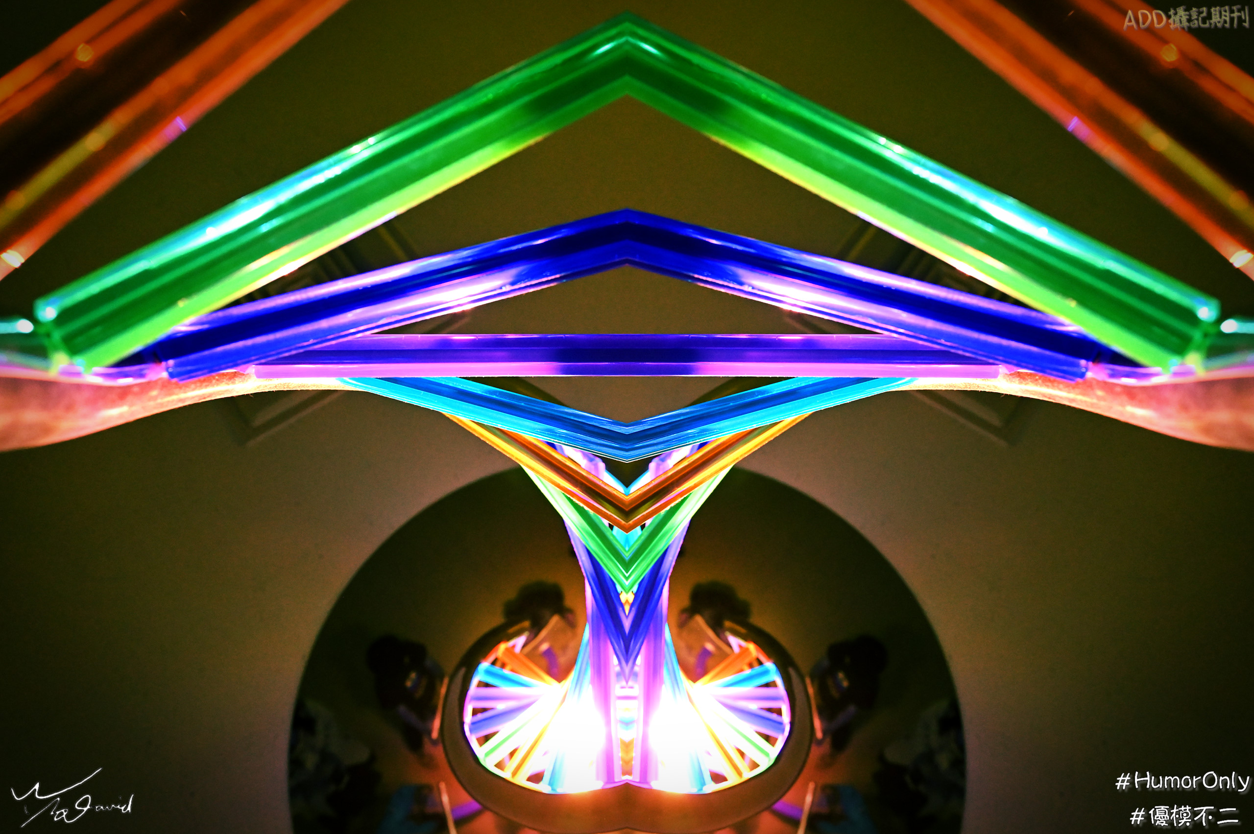 下圖就更有趣味性,原圖其實是上張照片同一天在美麗華拍攝,當時想用慢速快門做移動光軌的拍攝,試拍了幾張失敗,但沒把照片刪掉,整理時,想到可以利用鏡射找出對稱圖形,用幾張失敗的照片,慢慢疊出這張作品。至於如何疊圖,未來會再編寫文章做說明。這張照片用於【看見你的訊息傳遞】文章,影射到人體經脈,由抽象到具象的跨界聯結,也是一種創意發揮。