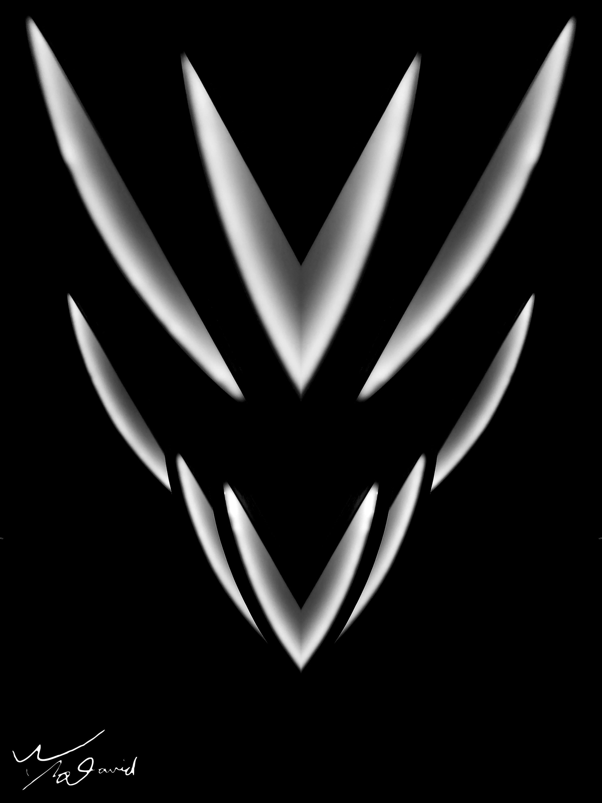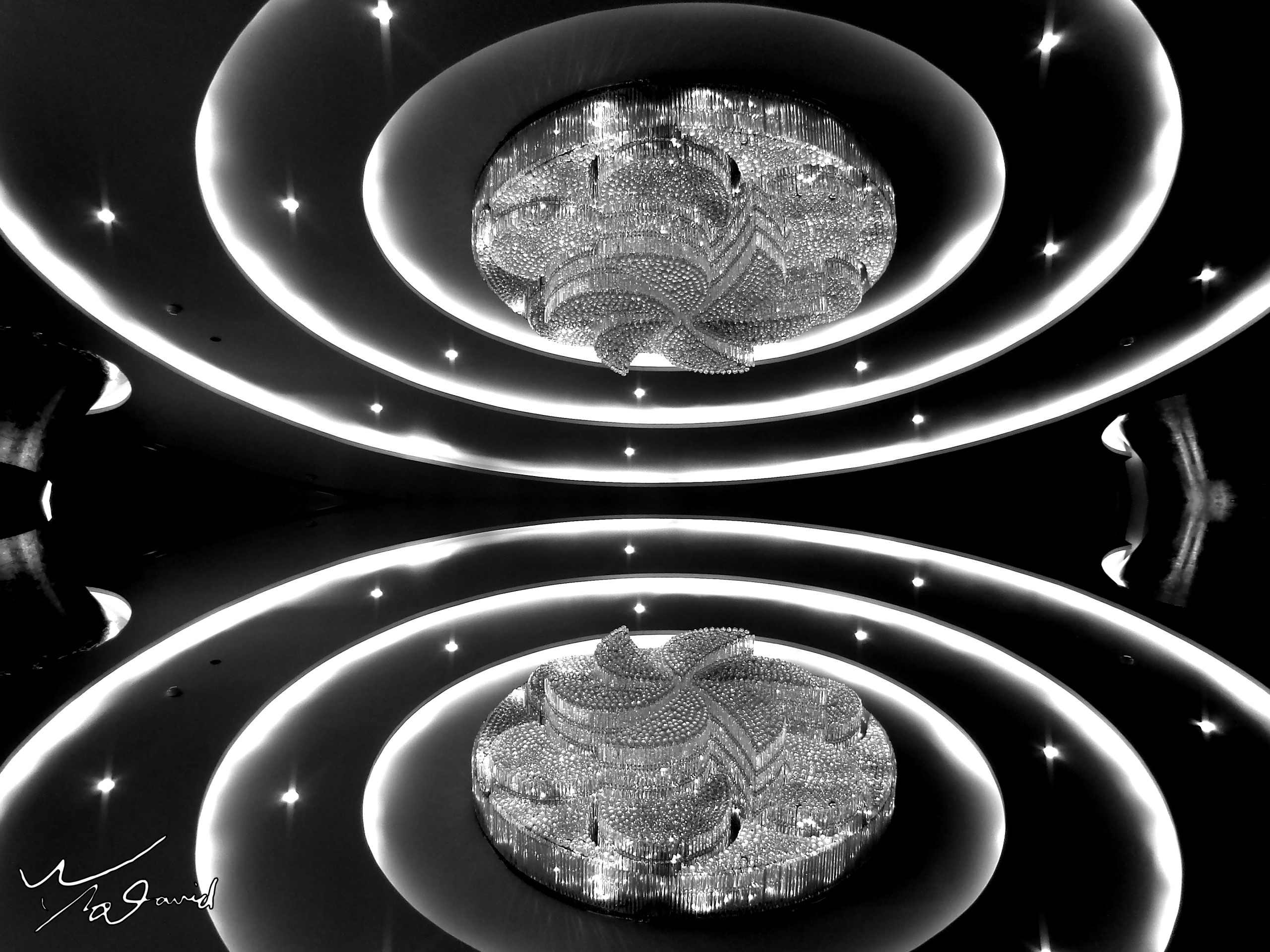 下圖是20180113在美麗華貨用手機拍攝建築內部,對半左右鏡射後,改成黑白照片,中間部分呈現一張臉譜效果。加上白色弧形亮光的曲線,有聚焦的視覺效果。