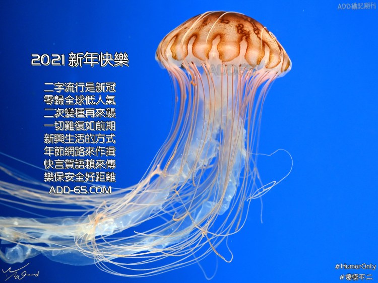 再來一張今年的新年賀卡,筆者慣用藏頭詩表達,底圖是去年陪客戶到桃園X-Park園區拍攝時,順便拍下的太平洋海刺水母照片(ISO-4500,F/4,1/200秒,EV+0.3),直接加上文字,很快就可完成賀卡。