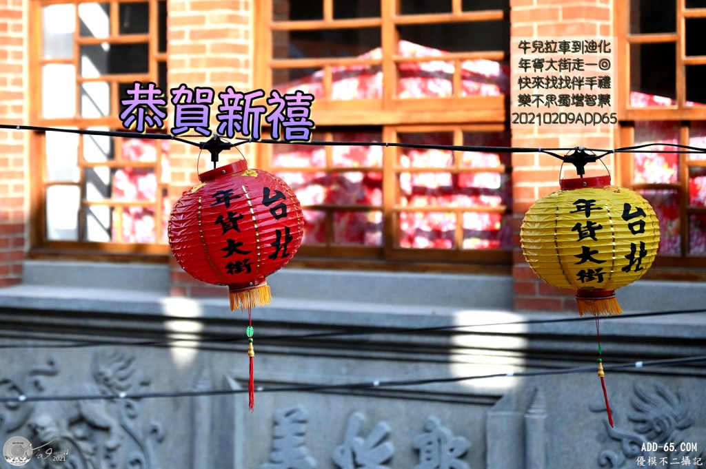 來張過年在年貨大街的應景照,在合騰堂二樓拍攝,燈籠電線避不掉,剛好用恭賀新禧四個字架上去,另外再加一首藏頭詩祝賀詞,就完成應景的賀卡。
