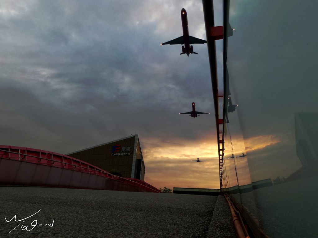 再舉一個合成的範例,2017年在圓山花博園區,中山北路上方的天橋拍攝飛機,把手機固定在一個位置,等飛機接近時,拍了三張照片,再把這三張合成下圖,就像有三台飛機接續飛行。