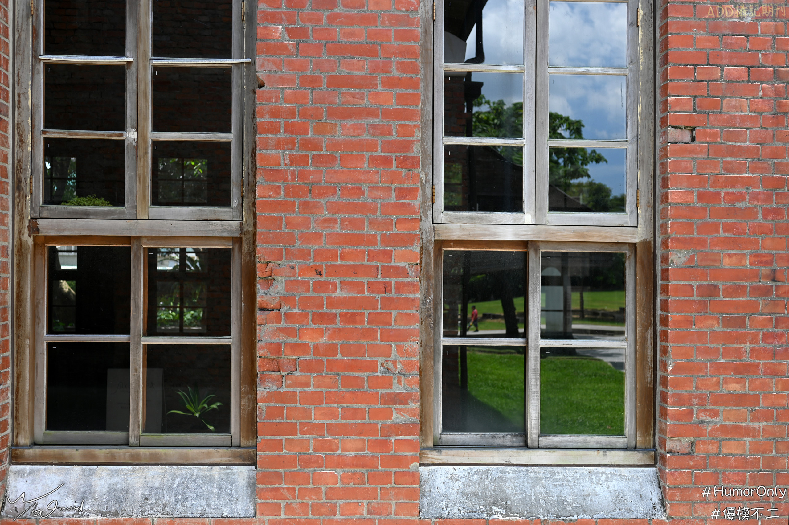 玻璃窗也是一個很好發揮的反射介質,下面五張照片,左上是20150303在宜蘭蘭陽博物館拍攝,由玻璃反射一對情侶,讓建築物的畫面有了生命。右上兩圖是20170818在公館寶藏巖國際藝術村拍攝,窗前的公仔,加上玻璃窗的反射,變得比較生動。下方兩圖是20200627在華人文創園區用35mm定焦鏡拍攝,利用窗面玻璃敍述著故事,下方左圖(ISO-100,F/3.5,1/320秒)利用中間紅磚防止筆者倒影被拍到,兩個窗戶左側是透過玻璃穿過屋內,右側明顯反射,由一邊透視一邊反射,加深了畫面的空間感。下方右側則是單純反射影像(ISO-100,F/3.5,1/100秒),一位遊客手拿手機,推著娃娃車邊走邊拍。