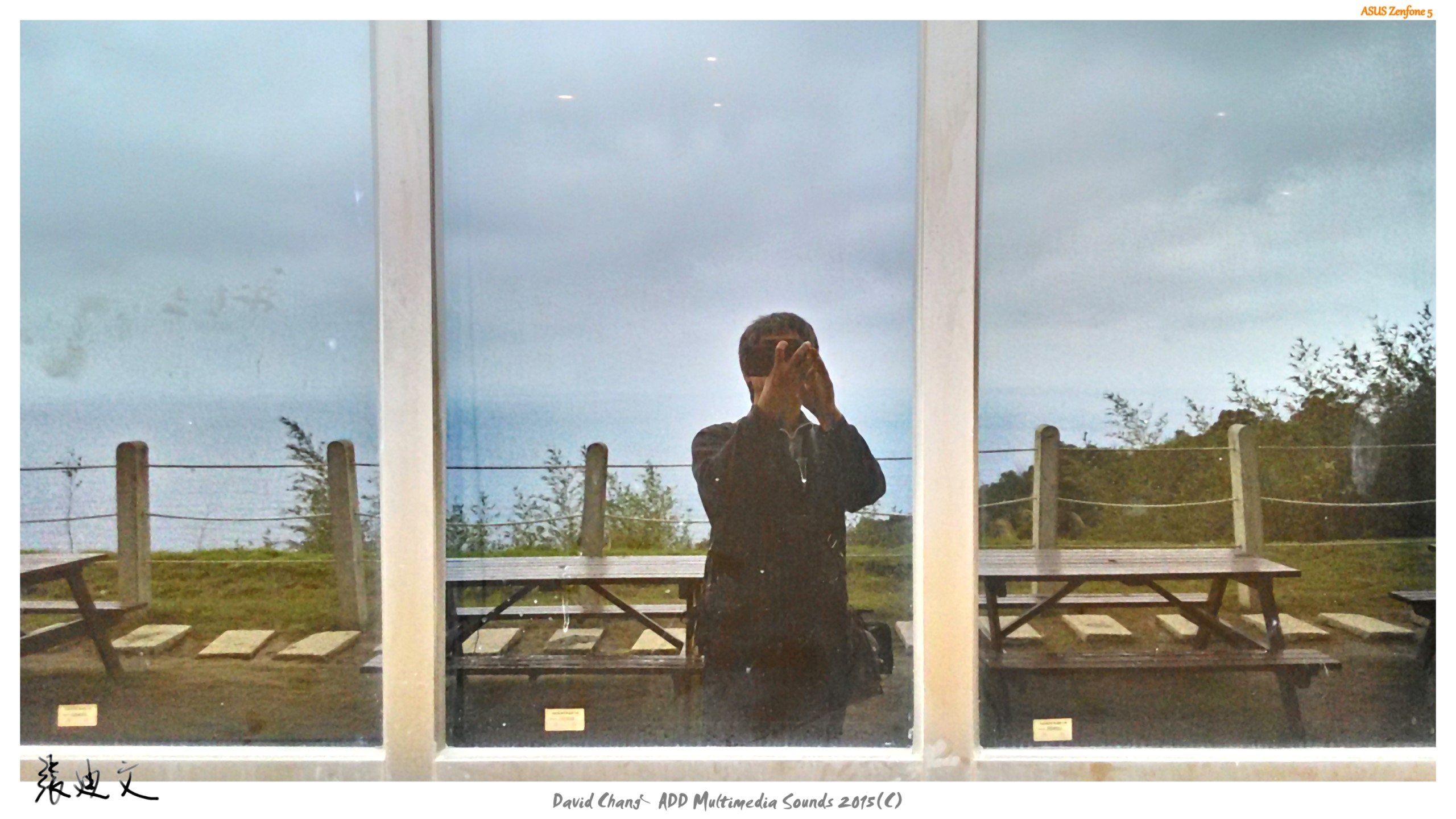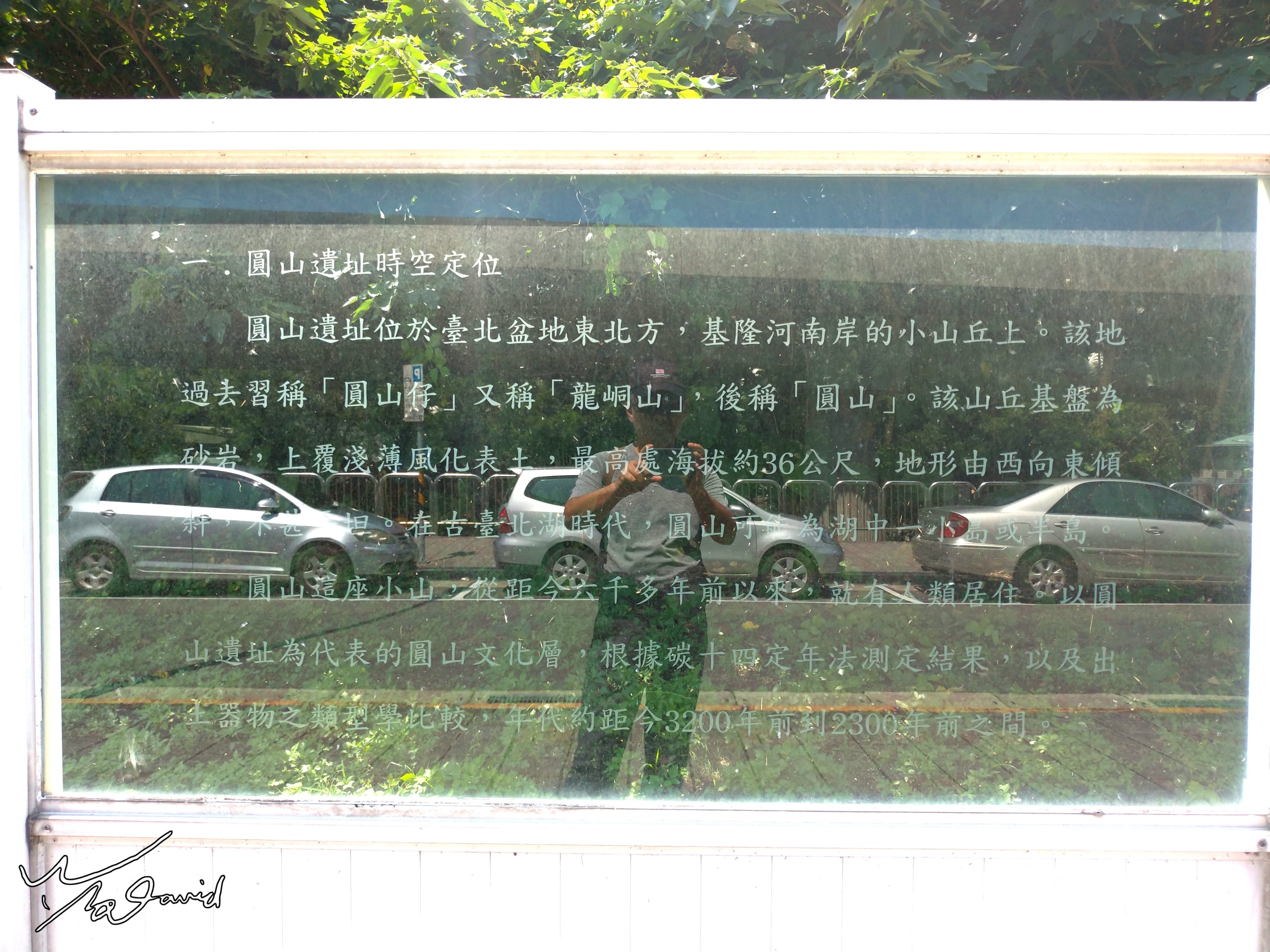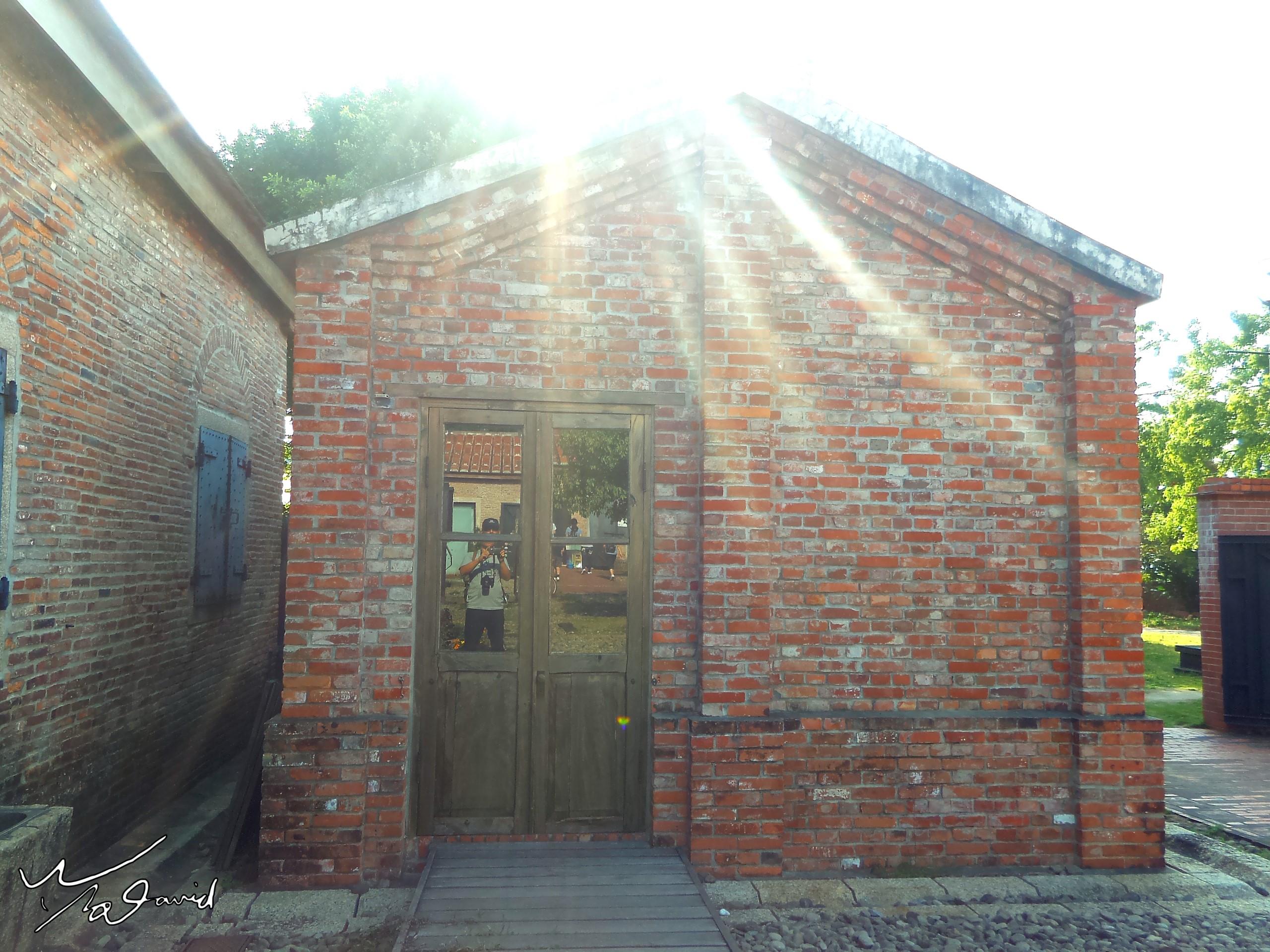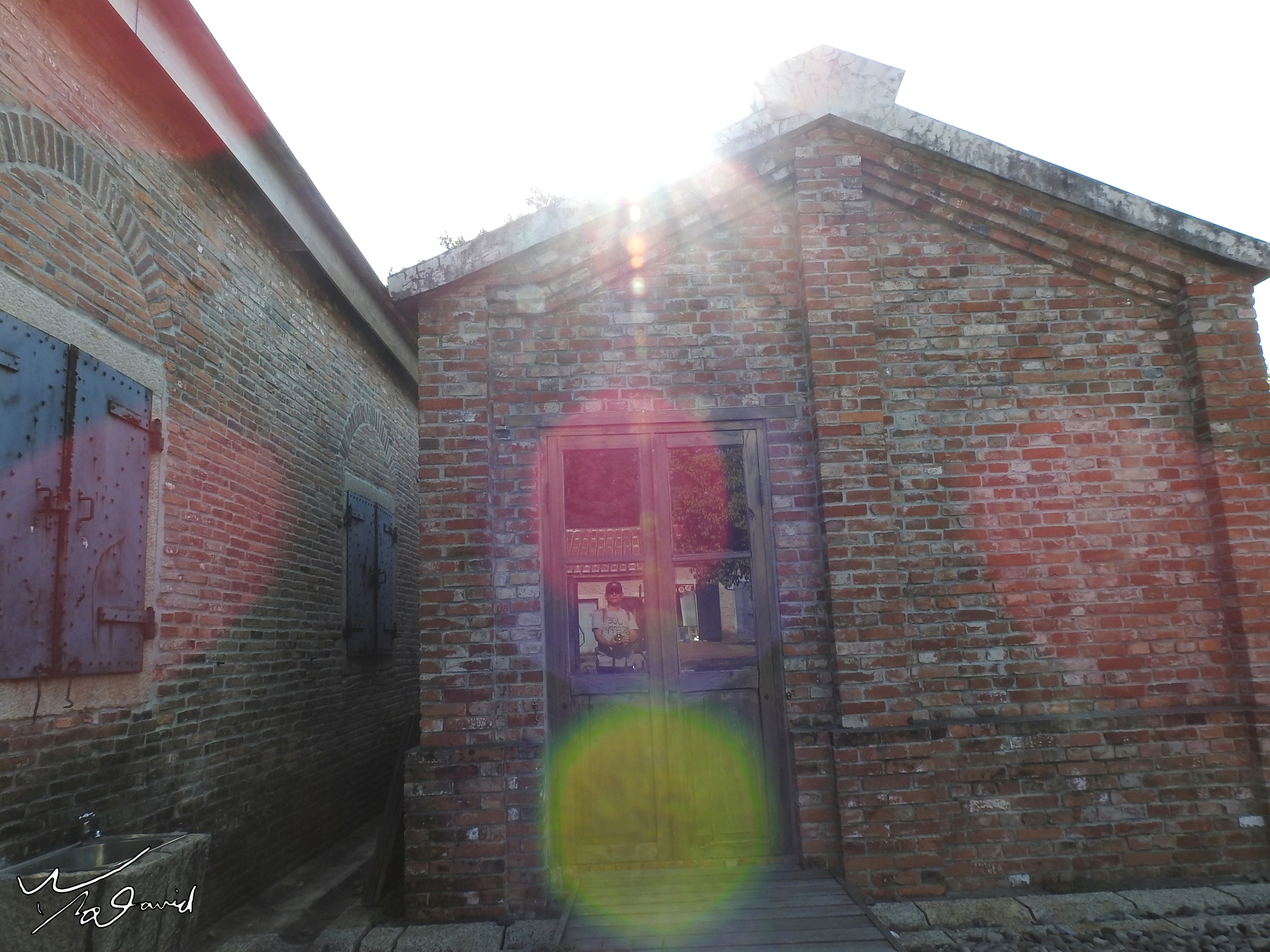下面都是利用玻璃反射自拍的作品,左上和右上,是在宜蘭蘭陽博物館拍攝,記錄筆者50歳生日的足跡,由倒影可以看到是用手機拍攝。右二圖是20180612在圓山捷運站附近勘景時,在圓人遺址介紹版前自拍一張。右三自拍照,是20130718在餐廳等餐時,用小相機對著天花板的玻璃拍攝。下方三張同場景的照片,是20180331在淡水文化園區殼牌倉庫,分別用手機和P900拍攝紅磚屋,當時陽光剛好切在屋頂位置,自拍時順便練習拍攝星芒。