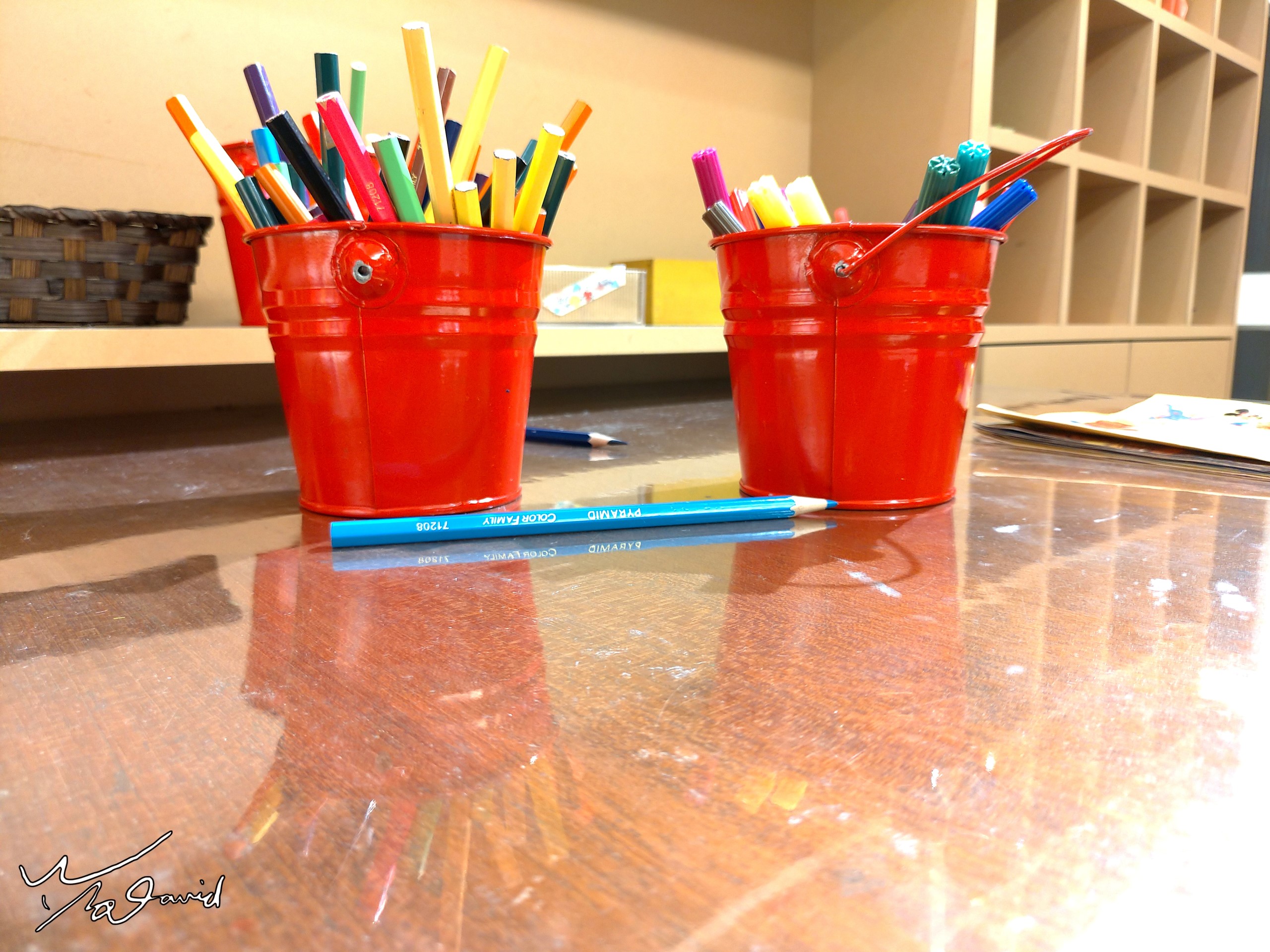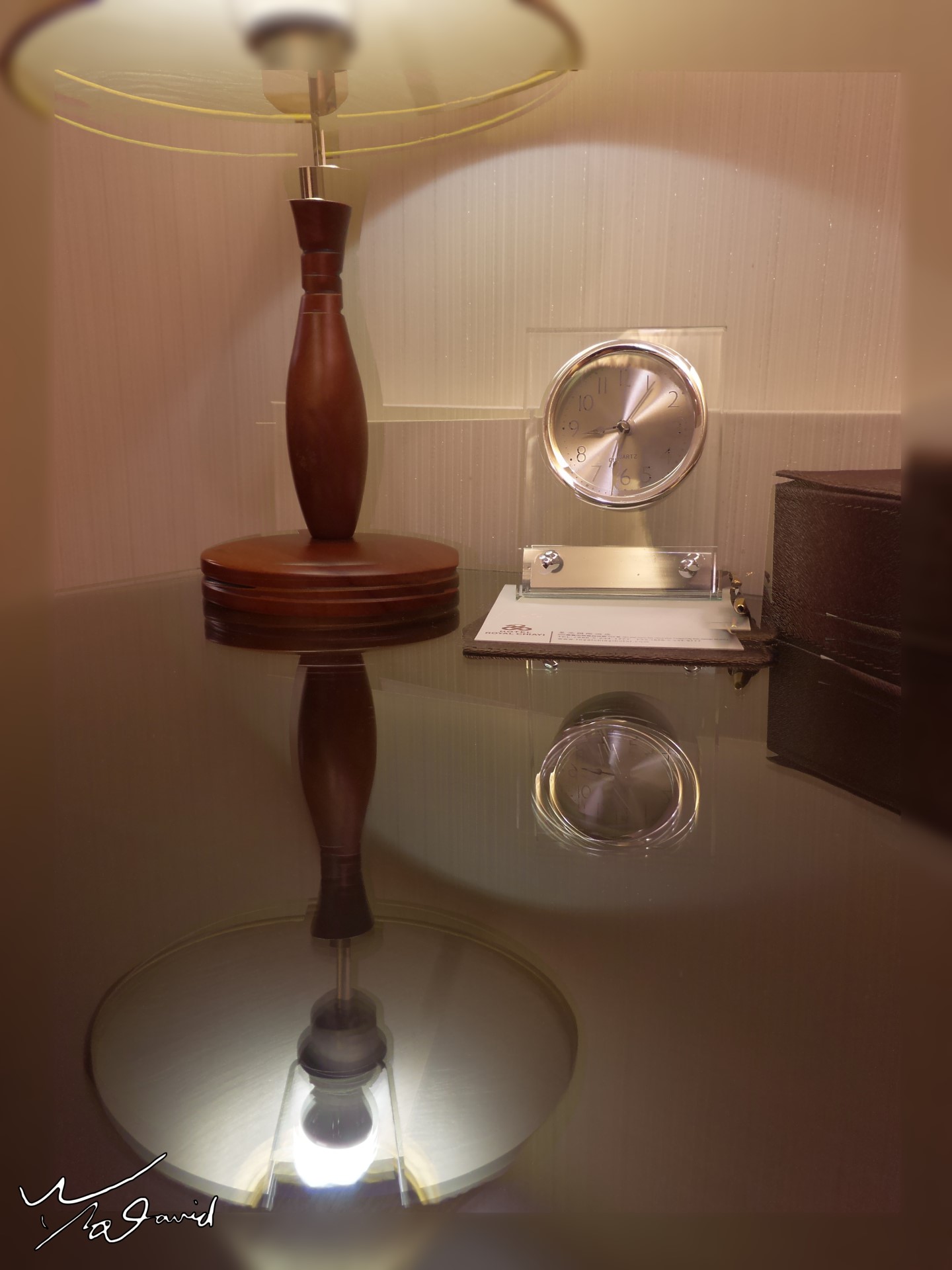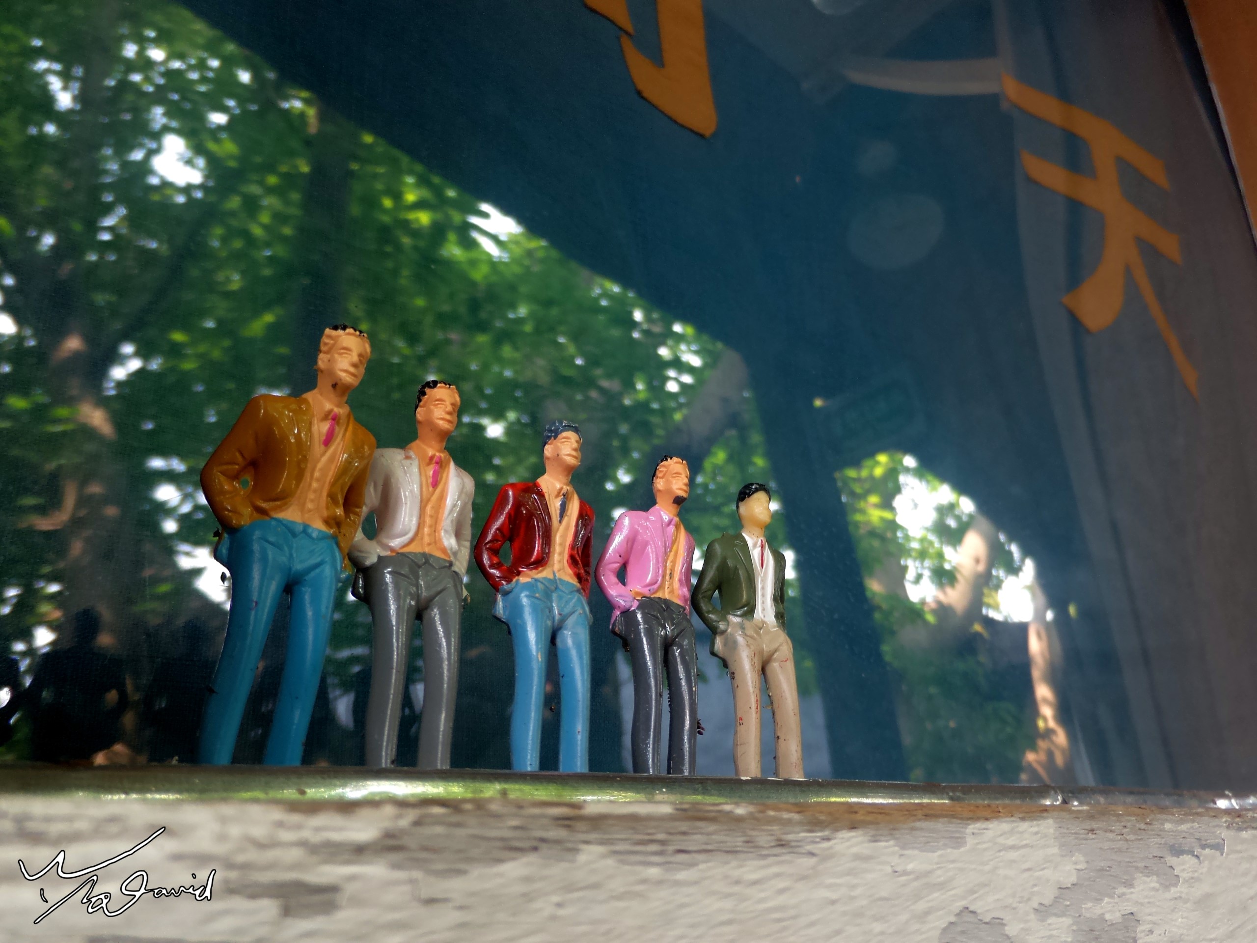 下圖是2017年3月利用四角玻璃瓶,放置在朋友從美國帶回NAMM秀的胸針名牌前,可以形成不同面向的倒影,一種強調名牌文字的手法,你知道我是誰嗎?