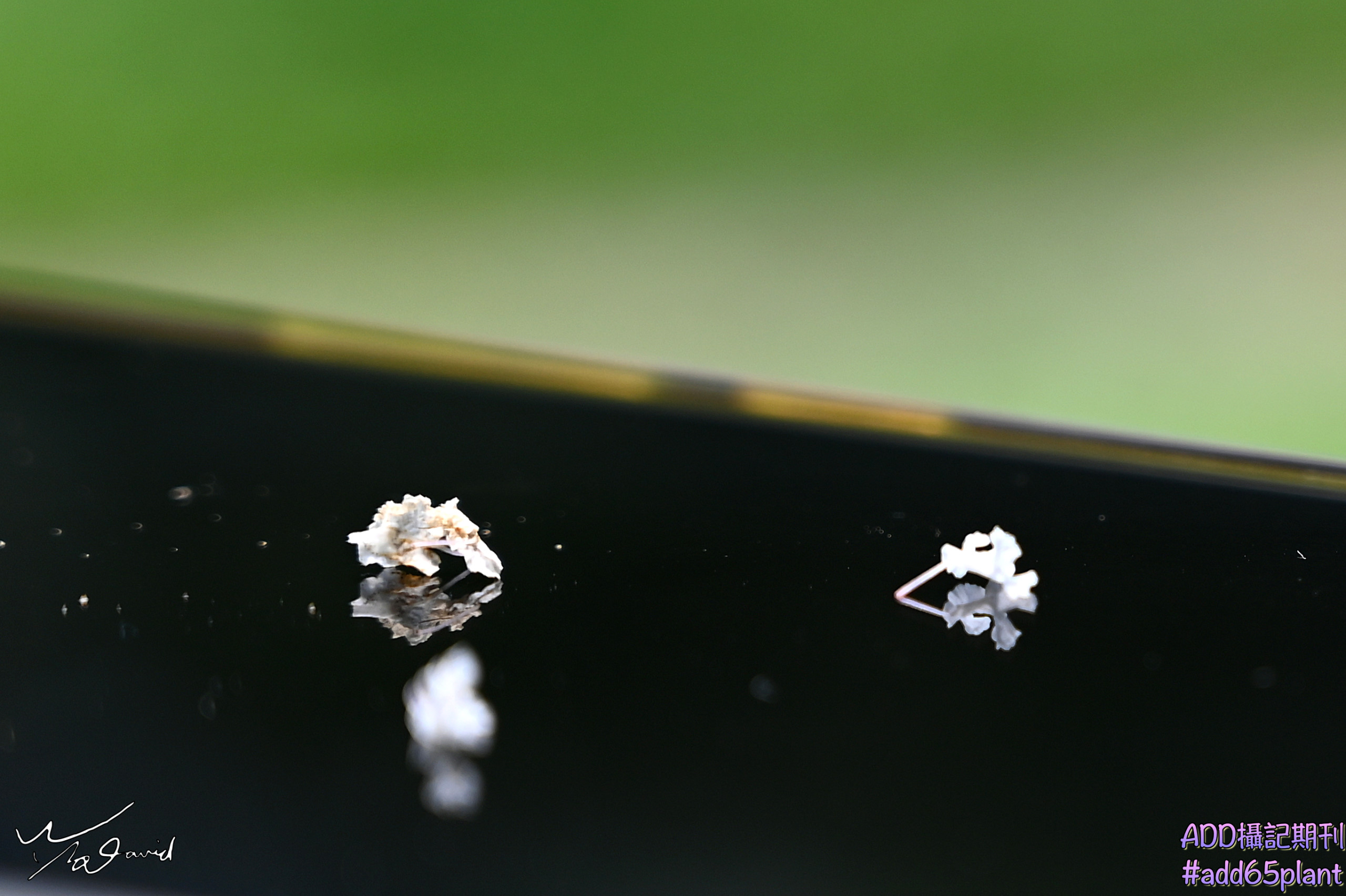 在鏡射應用文章發表後,再整理過去作品中,非後製的鏡射作品,通常稱為反射技法。不外乎利用實體鏡面反射的原理,在畫面中呈現倒影等,可以反射的物體很多,鏡子、水面、光亮的物體表面等,都可以當成影像反射的介質。主圖和下圖是筆者養殖的無尾鳳蝶,羽化後放飛前的記錄畫面,左手拿著手機,利用螢幕當成反射介質,右手拿著相機拍攝,留下這兩張畫面。(ISO-1000,F/2.8,1/2500秒,EV+0.3)