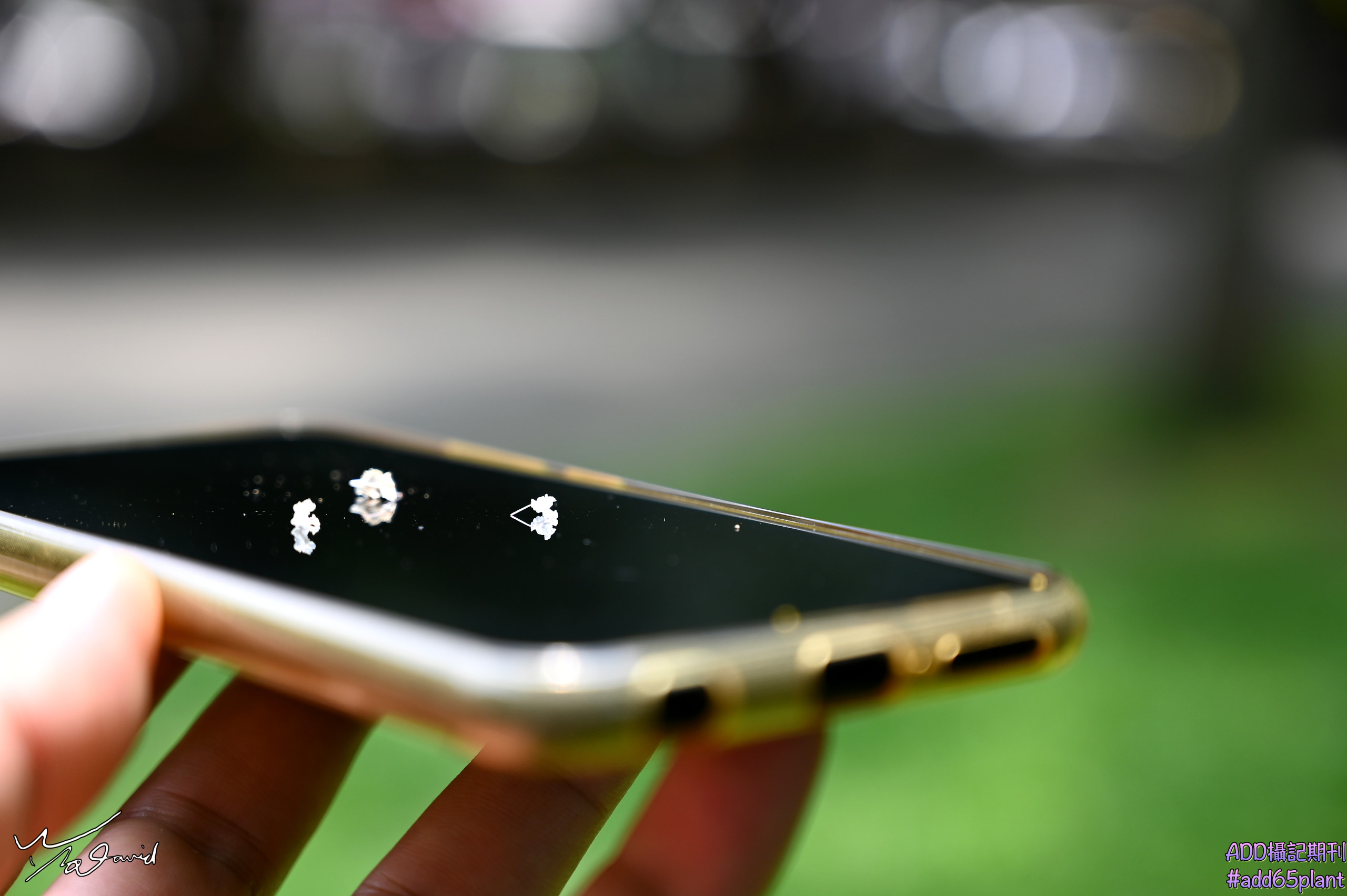 20190605捐完血後,在中和四號公園散步,看到九芎花瓣掉落許多,用手機呈接花瓣拍攝兩張。透過手機螢幕的反射,將焦點對準反射花瓣,有別於正常拍攝對焦的視覺效果。