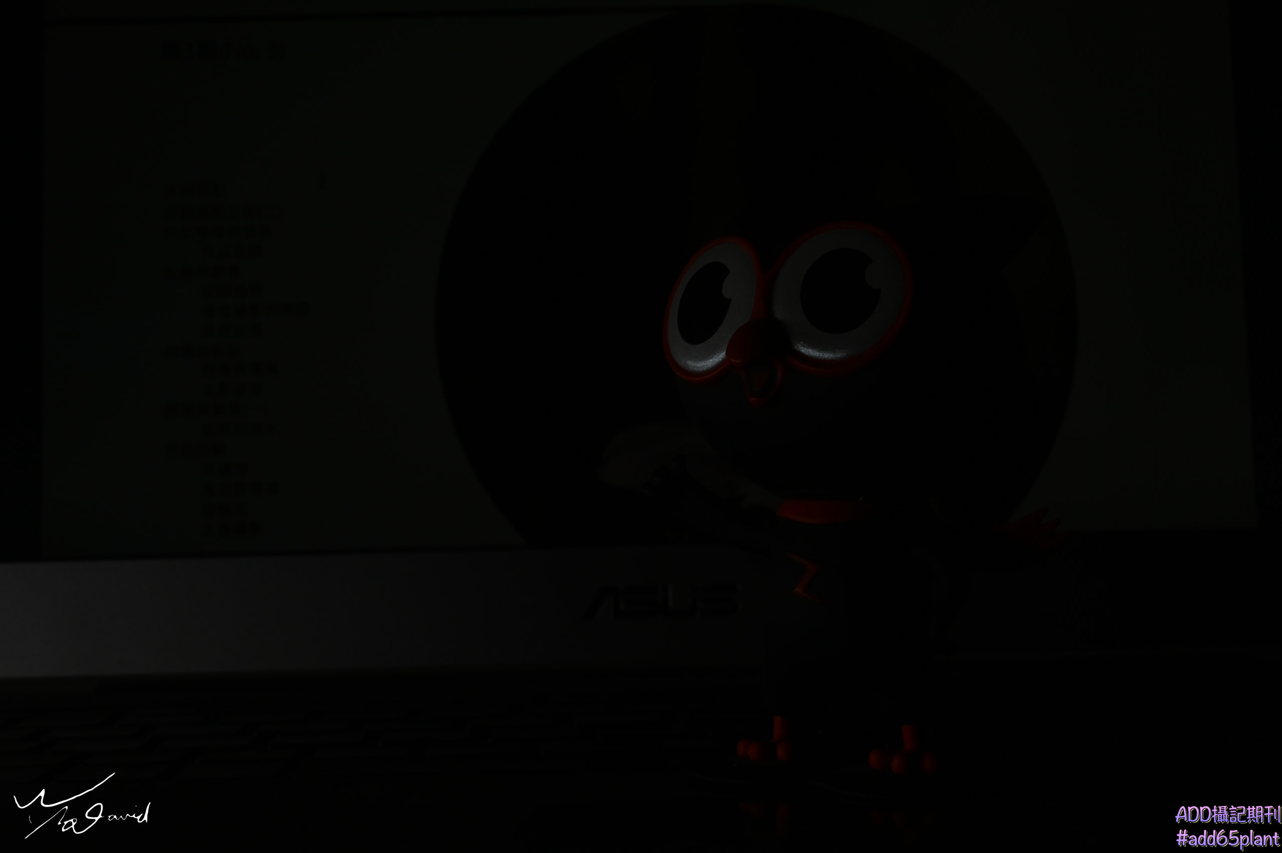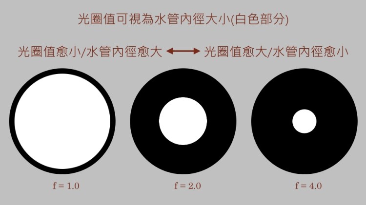 上圖例表示光圈大小變化,其孔徑也會跟著變動,白色的孔徑愈小,同一時間進光量就少,反之亦然。在其它控制參數不變的情況下,只改變光圈大小,最明顯就是讓畫面的明暗度變動,再來也會影響背景虛化的程度。只看文字說明,較難體會,我們來看看下面三張照片,只有光圈變動,拍攝結果有何不同?最明顯差異就是整體明暗度變化。再比對左邊和中間兩張照片的背景文字,光圈值較小背景文字是模糊,中間的光圈值變大背景文字變得較清楚。右邊這一張因為進光量太少,幾乎全黑,所以也看不出來背景文字。