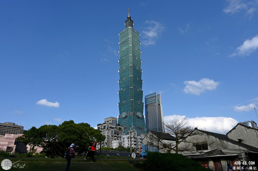 20210215到四四南村勘景時,等待雲層變動,想拍個亮眼的101背景,剛好有遊客在小土丘上拍照,觀察後,他們的動作很緩慢,為了讓背景101和雲層都能清楚記錄,設定ISO-100,F/22,用慢速快門(1/40秒)拍攝下圖。按下快門時,雲層剛好露出101大樓上半部被陽光照射,非常幸運。