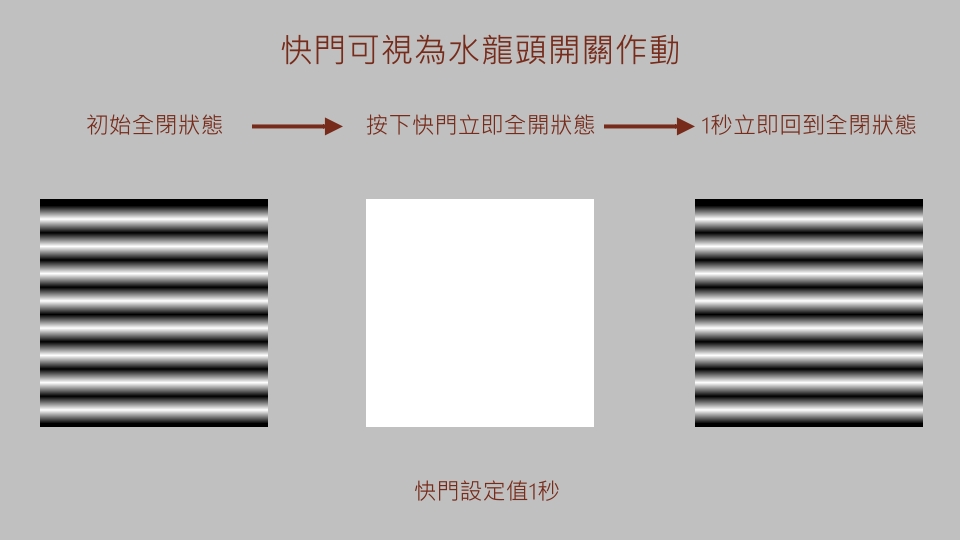 快門的定義,是相機門簾(可以想像成眼皮)的作動時間,平常是關閉狀態,按下快門鈕時,會立即全開(如下圖中間全白),讓光線進入相機內部的感光元件,依設定的秒數(如下圖是1秒),時間到會自動立即關閉,達到控制多少距離的光子可以通過快門到達感光元件。