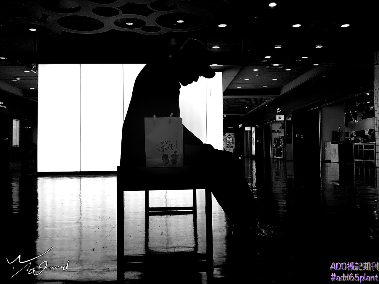 下面兩張照片,都是2017年在中山地下街用手機拍攝的作品,下左圖,在高亮光牆前的剪影,記錄當下遊客的舉動和情緒,右上圖是在另一側的光牆,當時作為燈箱展示一些老社區的照片,在前方有遊客坐著休息,和燈箱影像合而為一,非常有趣。右下圖是2019年一樣在中山地下街用手機拍攝,長者走累了,坐在光牆前休息,可以看出他的情緒是很累的感覺。