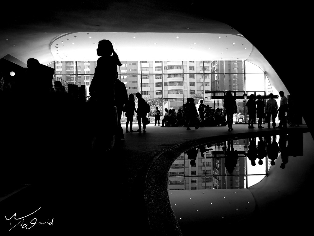 20170429造訪台中歌劇院,在一樓大廳用手機拍攝下圖,光影除了剪影之外,還有水面倒影,記錄當時遊客們的舉動和情緒。