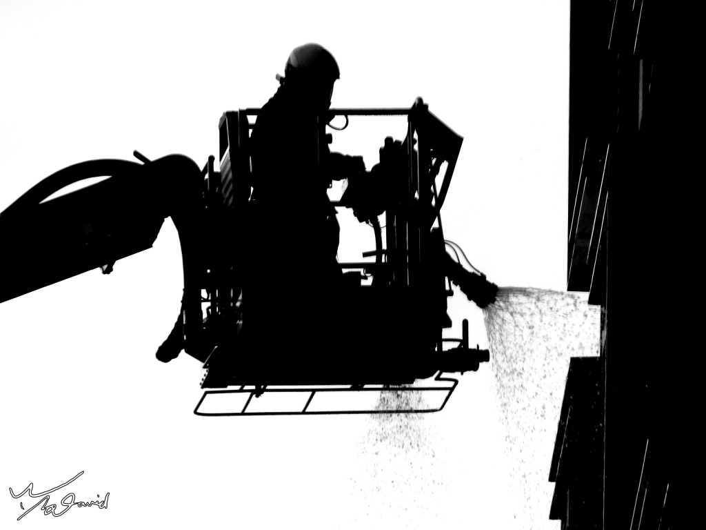 20180113在美麗華商圈街拍,剛好有大樓火警發生,消防以雲梯車灌救,筆者當時剛好在捷運劍南站,利用高度的優勢,拿著P900用長焦段拍攝下圖。