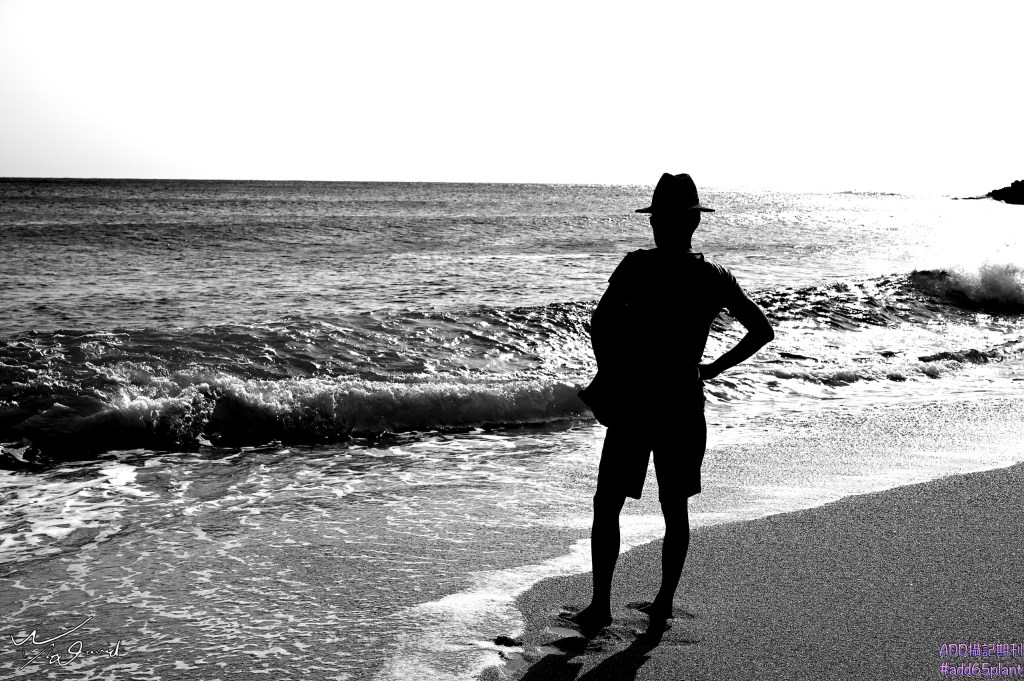 下圖2019年3月陪客戶到墾丁白沙灣拍攝,休息時,隨手拍攝這張剪影照,孤單望海的情緒,配合著海浪的接近,用黑白色調呈現一種視覺壓力。(ISO-100,F/9,1/800秒)