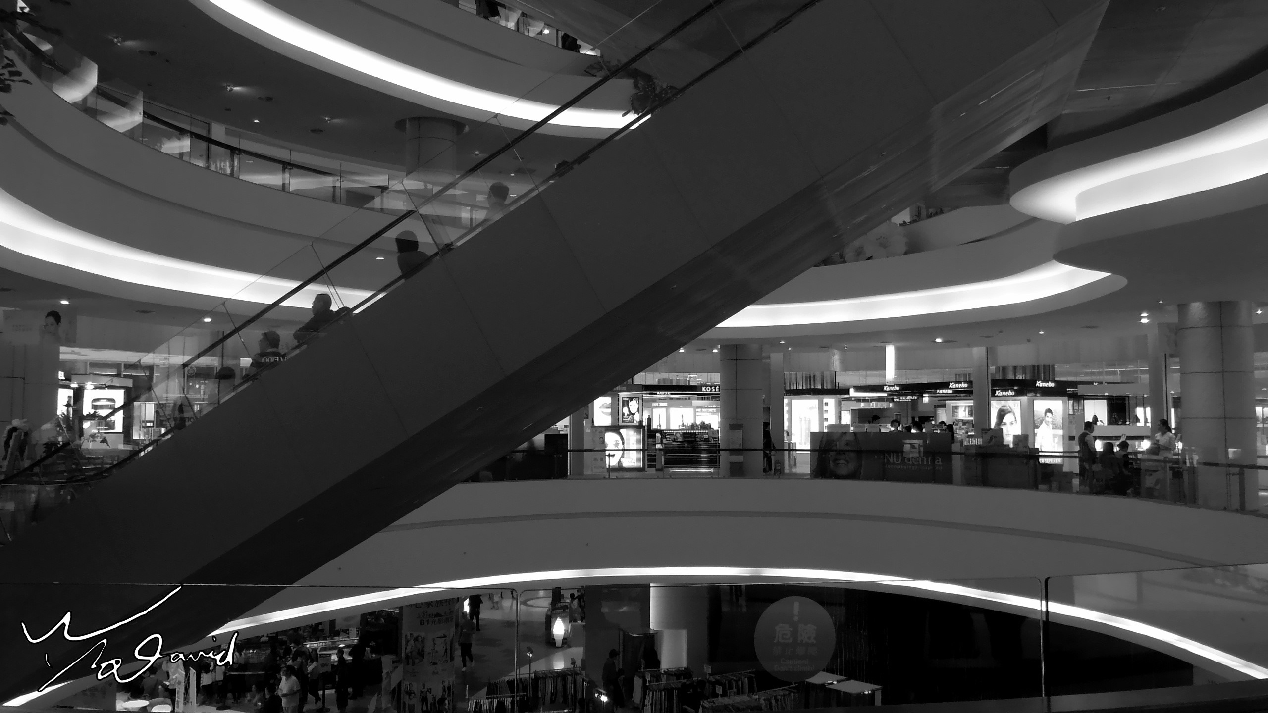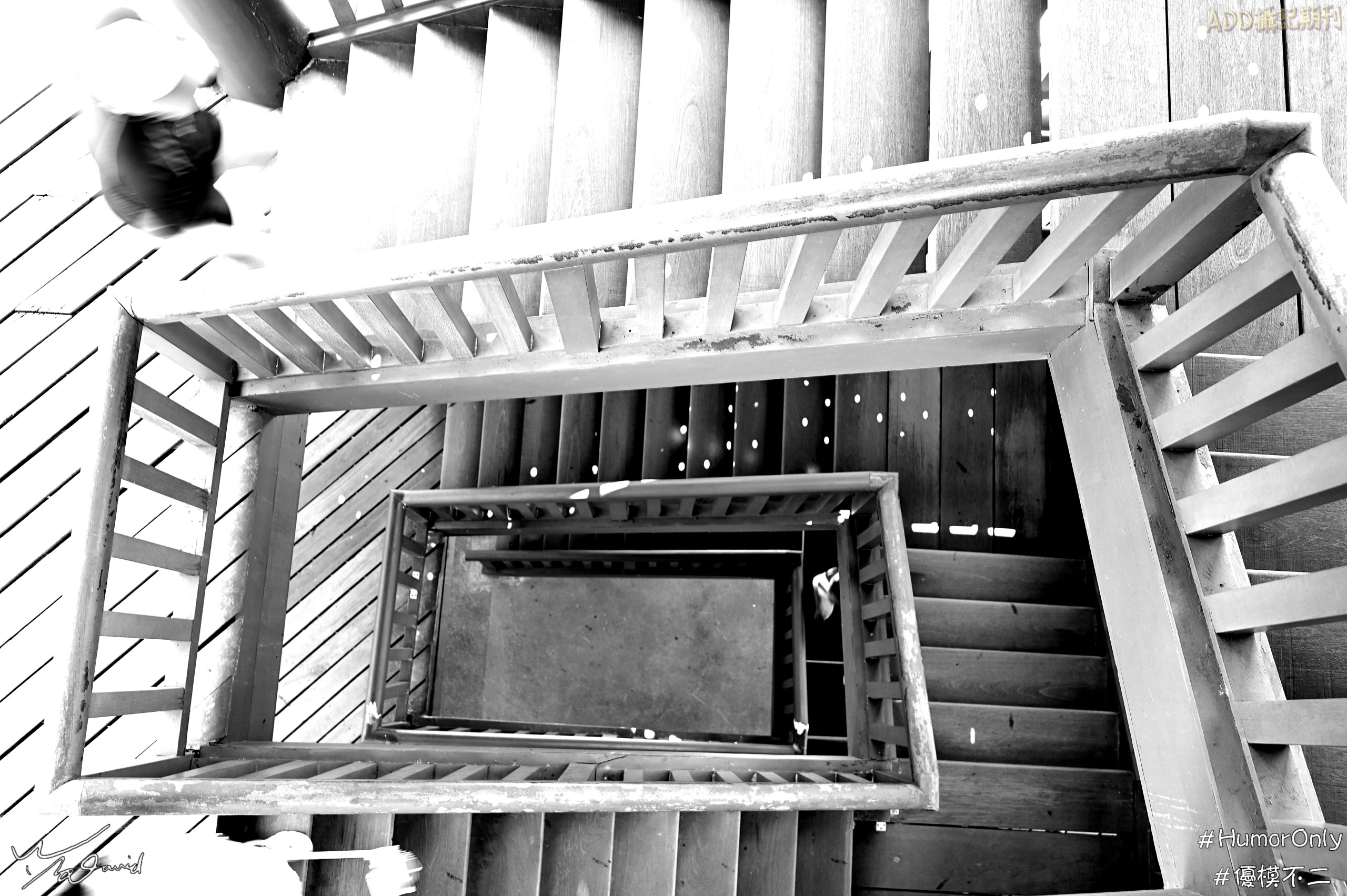 和建築體有關也最常被拍攝的元素,還有樓梯這一項,下面四張是常見的俯拍方式,靠左三張純粹呈現樓梯迴旋的感覺。左圖是在台南林百貨拍攝(ISO-10000,F/2.8,1/500秒,EV-0.7),除了記錄樓梯轉角的畫面,也留下光影對比的感受。中間左圖是用手機在社區安全梯間拍攝,樓高15層,所以中間穿透深度較多。中間右圖片是在新加坡聖淘沙拍攝,樓高4層,當時設定ISO-100,F/5,1/10秒,EV+0.3,用慢速快門記錄遊客在樓梯走動的身影。右圖則是2016在華碩總部活動時用手機的慢速快門拍攝,同樣俯拍樓梯,順便記錄人體移動的光影。