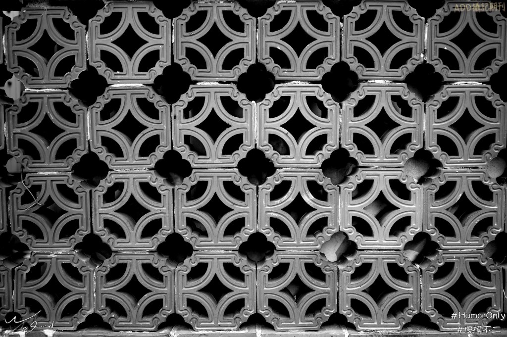 同一天,另一張測光照,是對著雕花牆拍攝(ISO-100,F/2.2,1/320秒),那一天是用35mm定焦鏡為主要拍攝鏡頭,所以變形量極少,由下圖可以看到建築線的垂直或水平都維持得不錯。透過黑白呈現雕花的立體感。