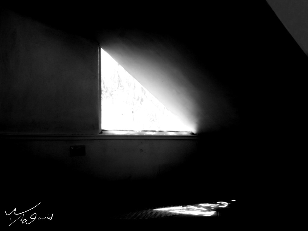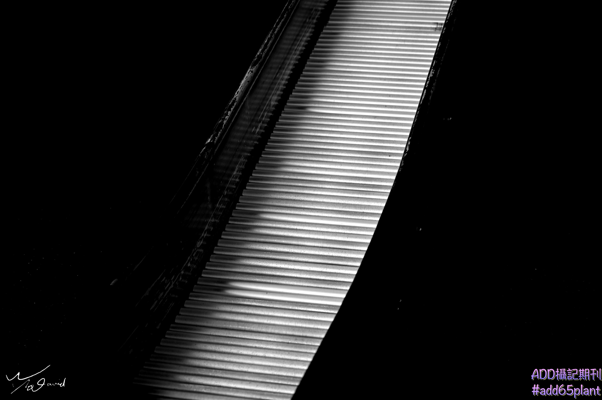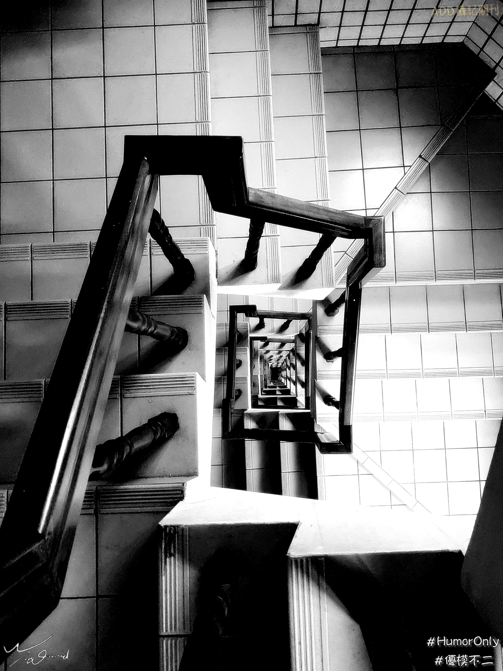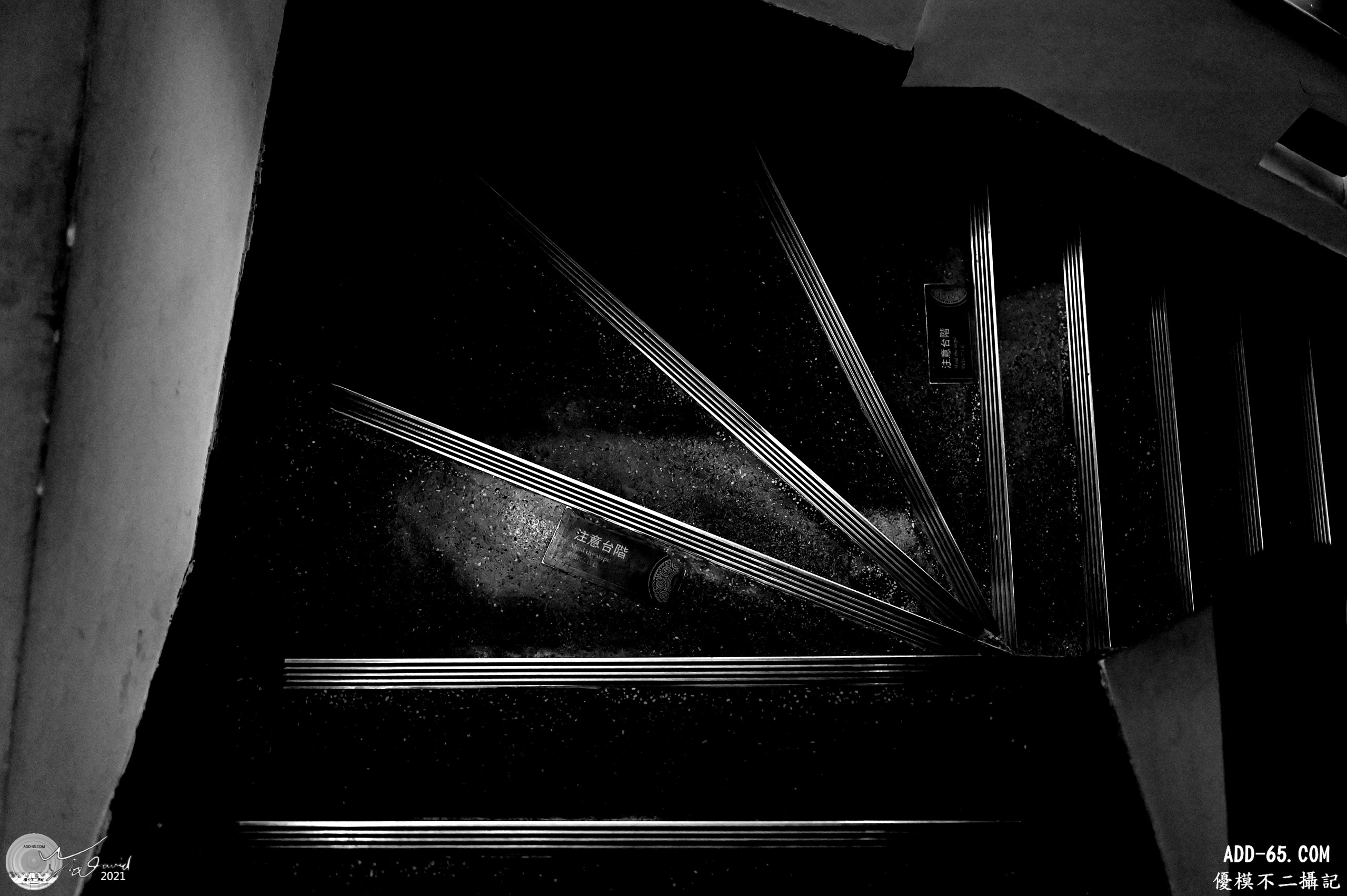 20170402在宜蘭拍攝時,經過樓梯轉角,發現下方有個窗口剛好被樓梯底板切成三角形,加上光的投射與反射,形成不同的幾合圖形,就用手機拍下這個偶遇的光影圖案,改用黑白呈現,強化反射和窗口(圓弧與扇形)和直射光(三角形)之間的關係。