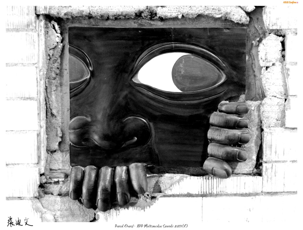 20150416在華山文創拍攝時,發現牆面有個破洞,就用手機拍攝這個有趣的洞口,這洞原本是一個窗戶,移除後,用一片木板貼上去,畫二這個圖案,就像一個人由裡面往外看的感覺。拍後用黑白呈現這種偷窺的感覺。