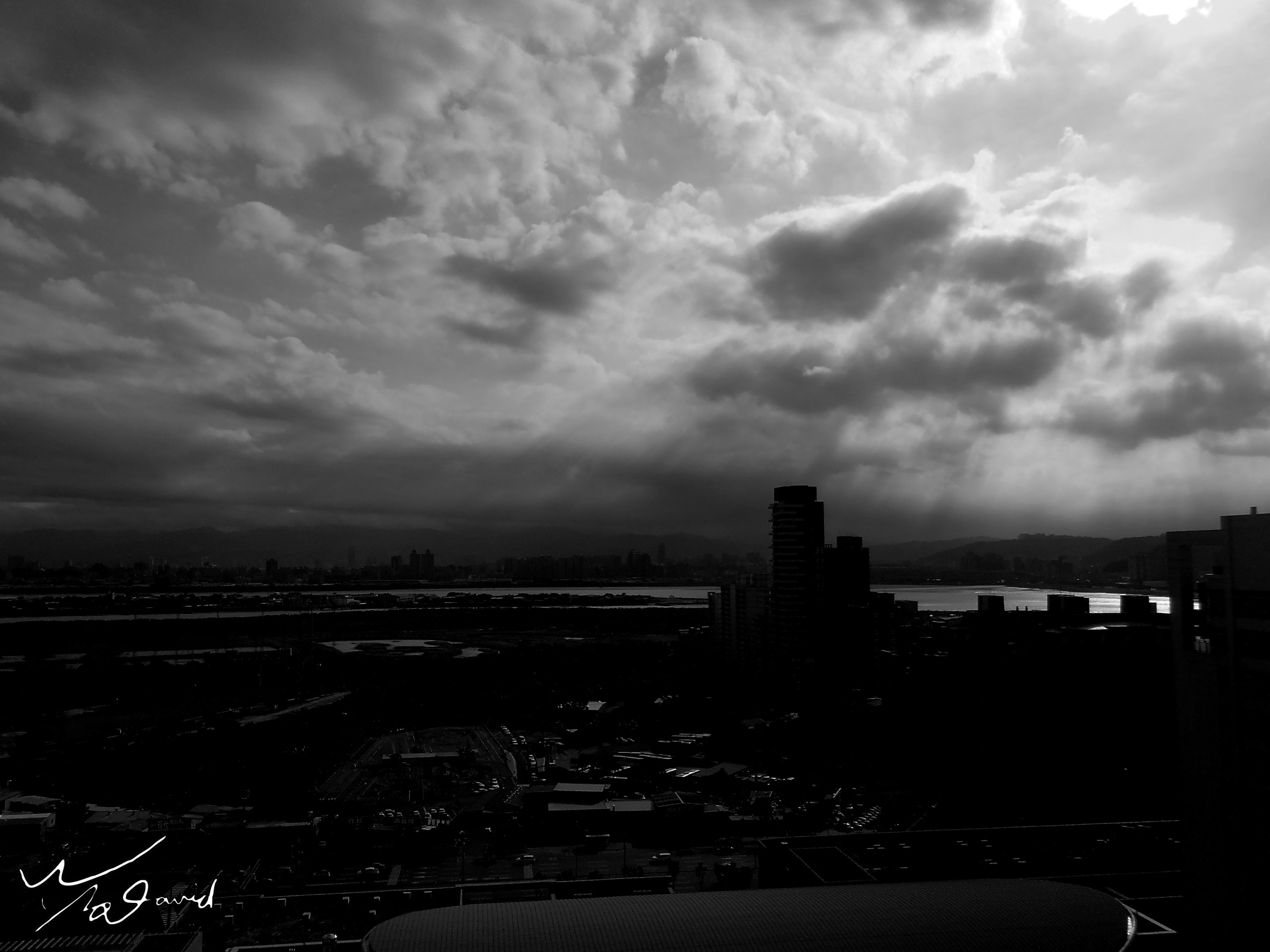 耶穌光用黑白色調呈現,是可以強化對比,純化視覺。下面兩張照片也是以耶穌光為主題,左圖是用P900拍攝(ISO-100,F/3.2,1/1600秒),右圖則是手機拍攝。兩張都是20171215在華碩總部的董事長辦公室往淡水河拍攝。這種大景常常在短暫時間裡變化很大,所以要能快速調整和拍攝。