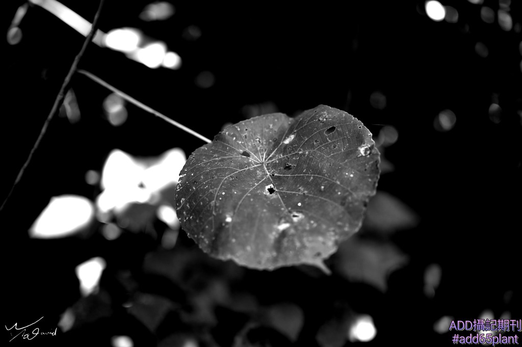 這張以血桐葉片為主的照片,是20191111在新店天山公園拍攝(ISO-250,F/1.8,1/200秒),意指形隻影單。當時剛購買35mm定焦鏡,利用公園裡的場景在熟悉它的定位,這一張用最大光圈,形成極淺焦段,本來想對焦在血桐葉脈中心點,但後來往前移了一點,讓中心點有點糊焦感覺,讓整體畫面更有形隻影單的感受。