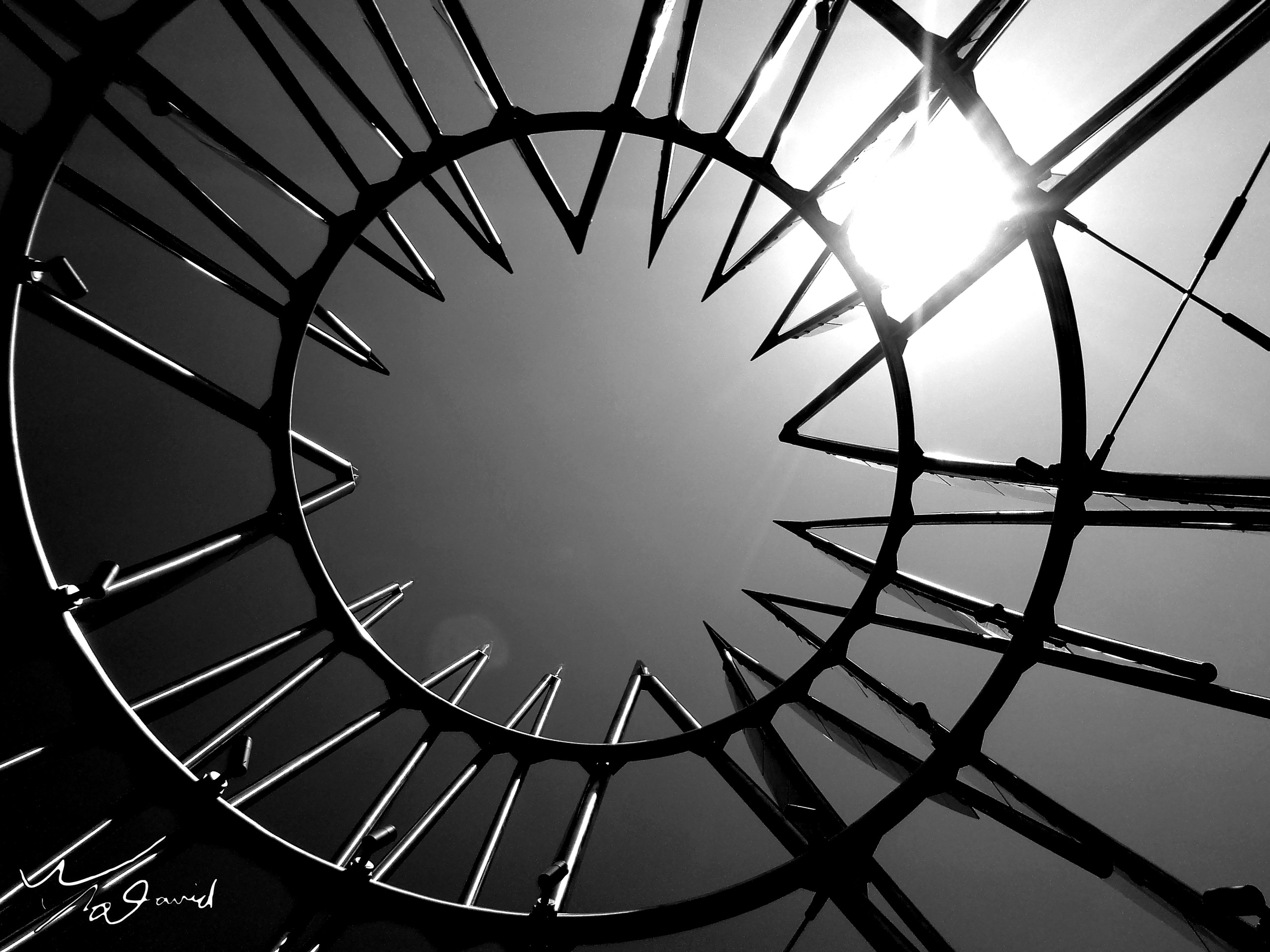 同一天走在台中市議會前的公園裡,發現兩個可以仰拍,並且改用黑白色調呈現的場景,左圖是隔著密孔鐵網,往上仰拍太陽。右圖則是本來想拍太陽在箭形中心點,但發現光斑太嚴重,所以移位把太陽放在圓周邊上。因為手機的特性,較難拍出星芒,最多只有兩條線而已。這種黑白照片,可以明確表達出意念,左圖是法網恢恢,右圖可以想像成射日。