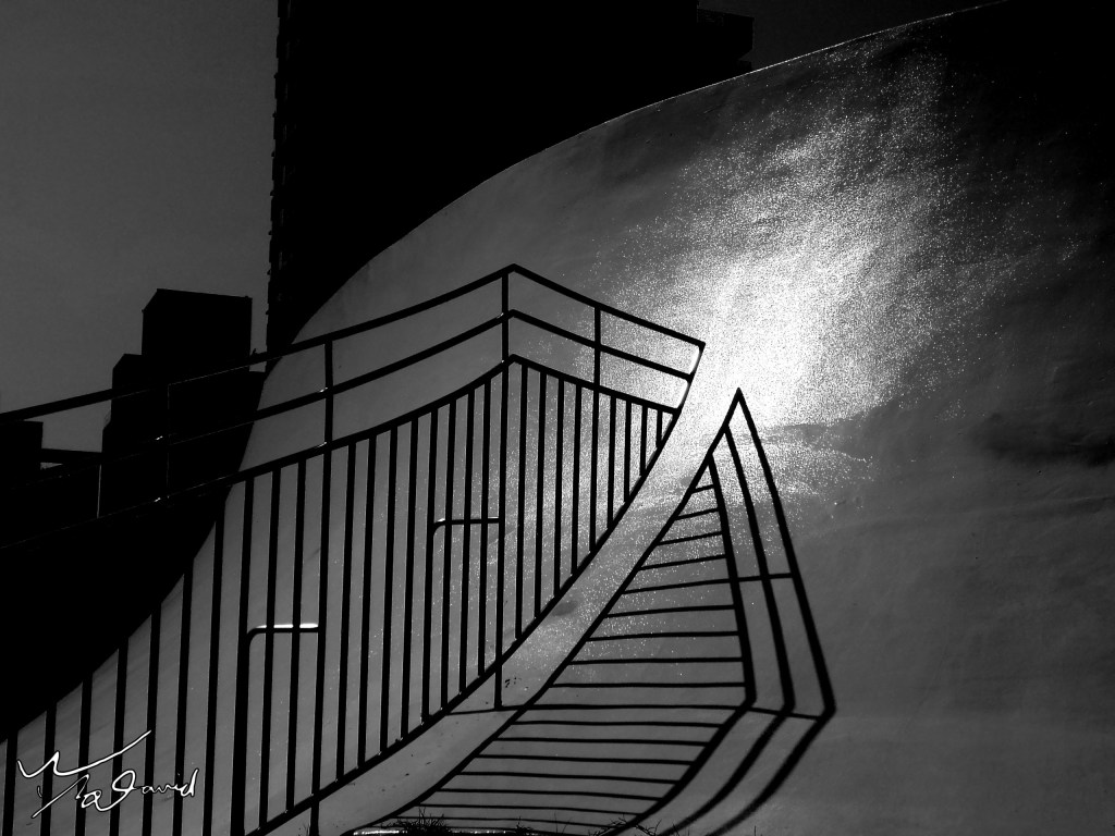 20170429在台中歌劇院頂樓,發現陽光照射欄杆在弧形建築頂上,形成鏡射的效果,拿起手機記錄下此刻光影,改用高對比黑白照片呈現,風味更加獨特。