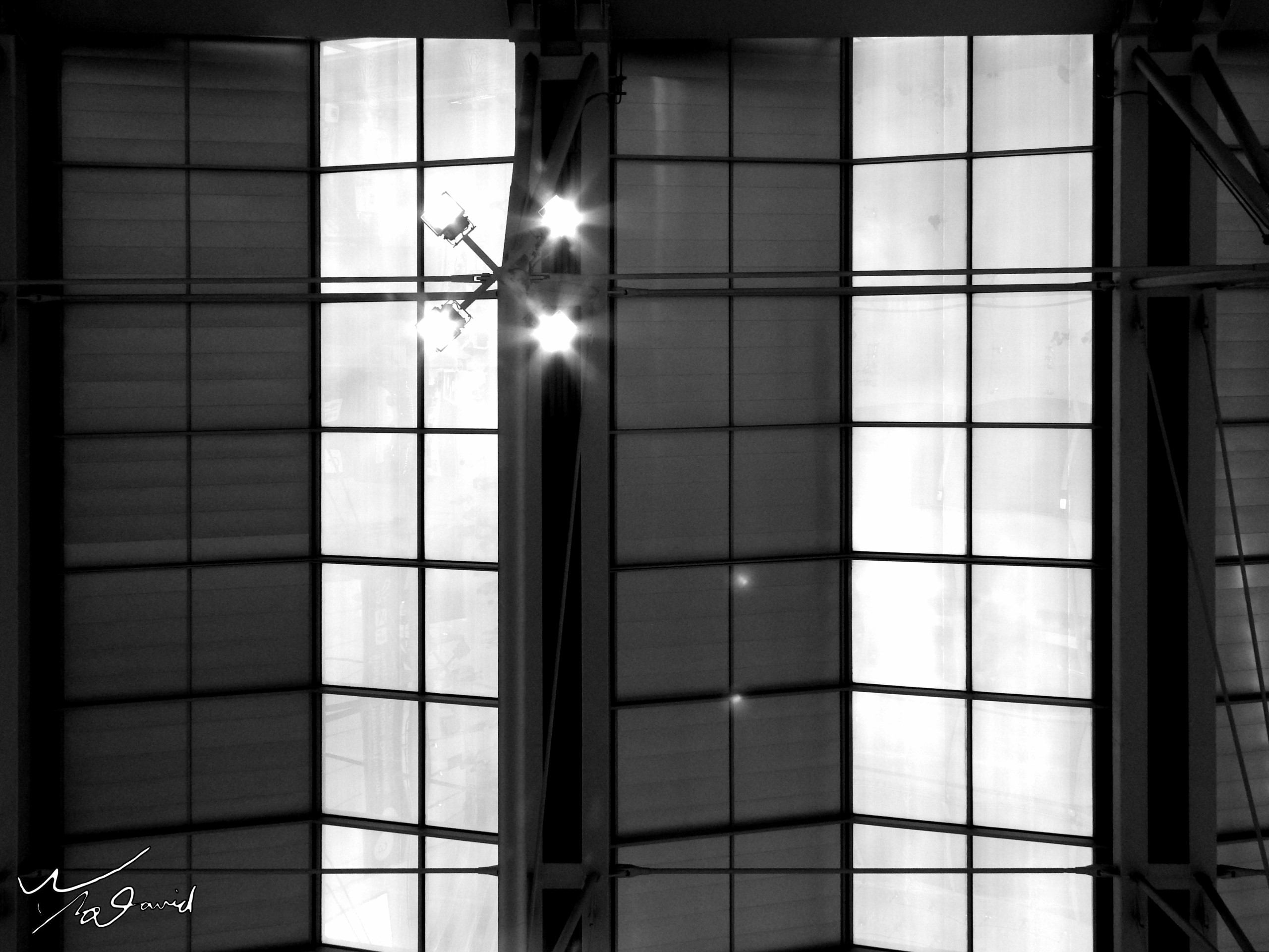 提到仰拍的黑白照片,還有下列兩張,左圖是20170609用P900在泰國機場候機回國時,拍攝天花板(ISO-400,F/5,1/30秒),對稱式半採光屋頂,算是綠建築的特色。右圖20170713在中和四號公園時光廊下用手機仰拍,交叉的樑形成十字架,太陽剛好可以在中心點旁切出,時光廊的牆面磁磚反光下,同時記錄下這個影像。