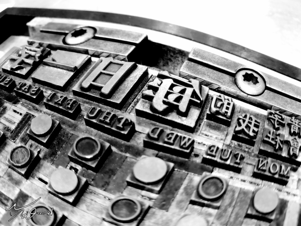 20180918在中山地下街的誠品,看到展示早期凸版印刷的設備,用手機對著鏡射字拍攝,再用魚眼效果修飾,改成黑白色調。