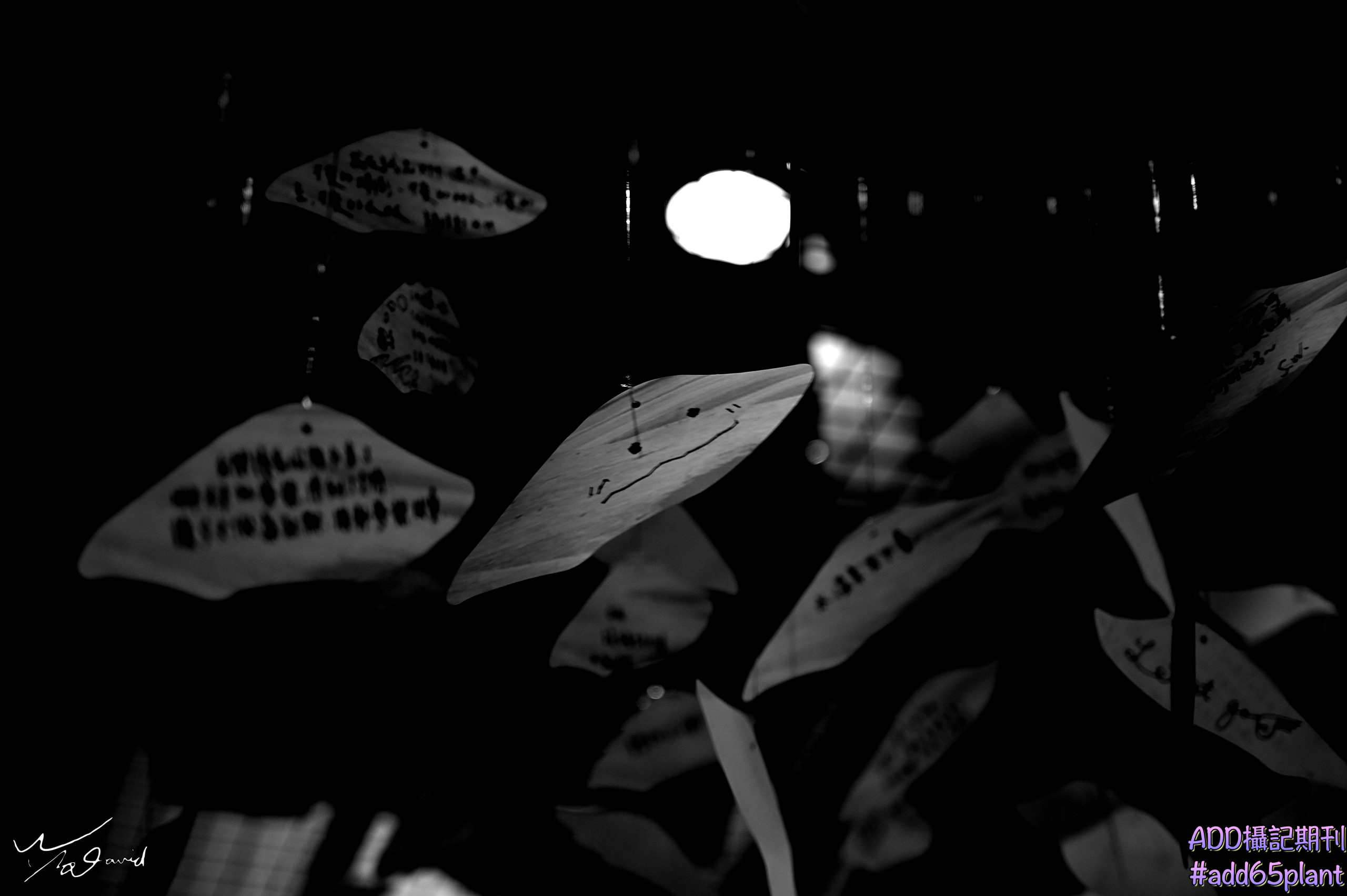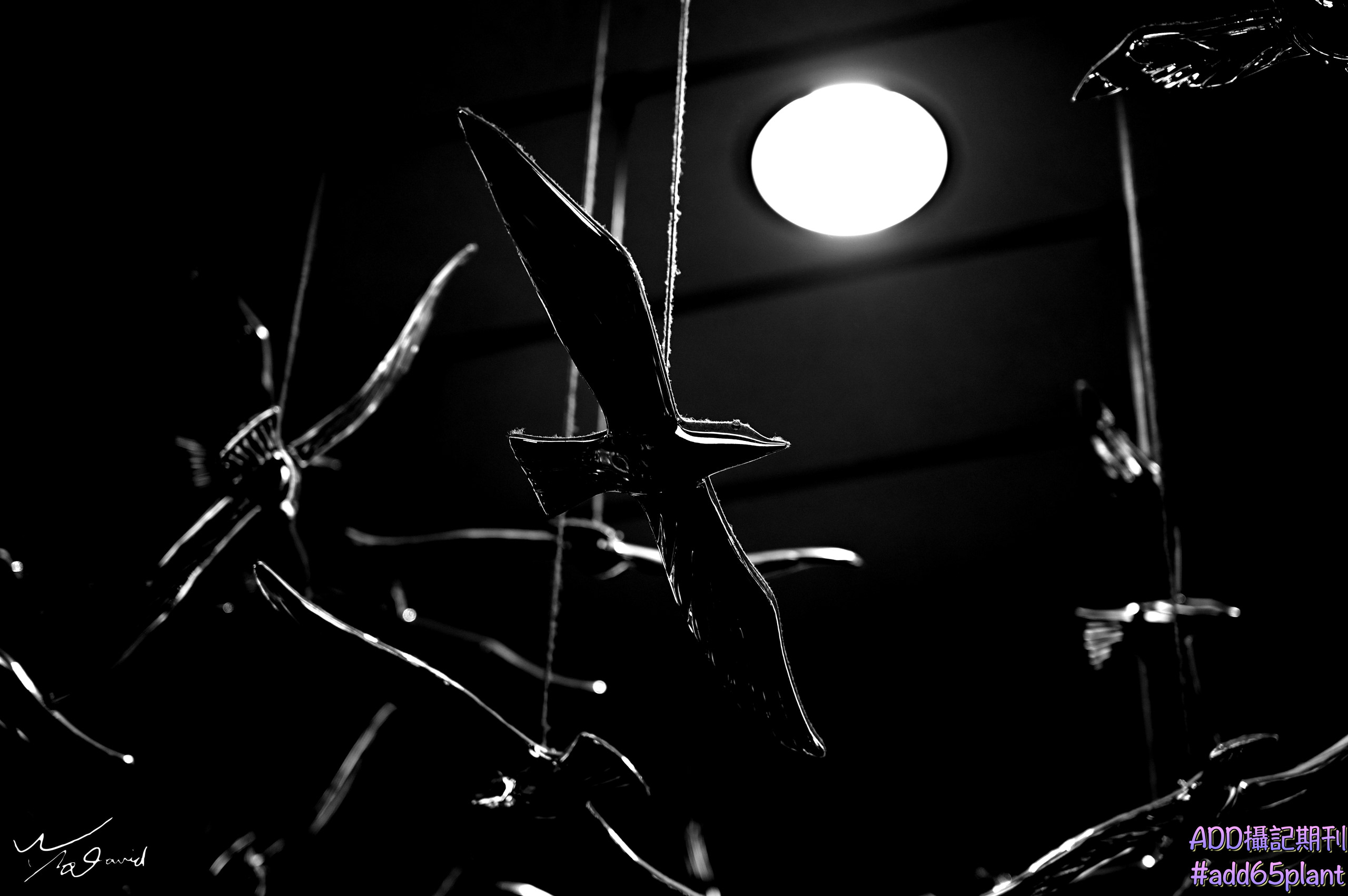 20190907那一天,在中山地下街走拍時,有個展覽,現場懸吊著許多祝福的卡片,就拍下左圖,以其中一個笑臉為焦點的黑白照(ISO-400,F/4,1/40秒,EV+0.3)。左圖則是在附近吊在走道天花板上的鳥形裝飾,上面沾了許多灰塵,對著其中一隻,調整角度,剛好燈光的照射下,似如描邊的效果(ISO-400,F/4,1/60秒,EV-0.7)。這是街拍的樂趣,可以找尋隱藏在背後的細節,作為拍攝的主題。