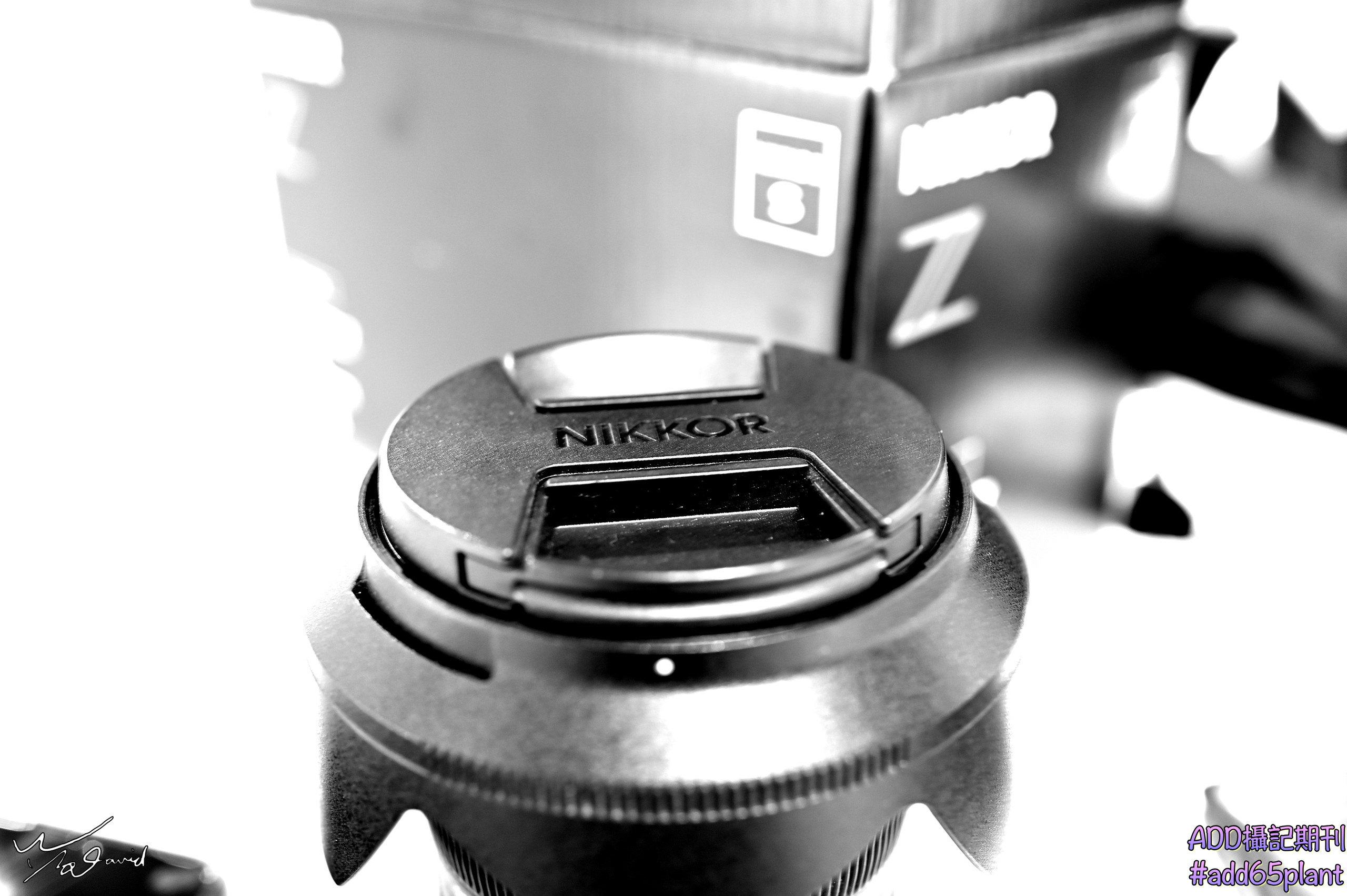 拍攝物件,用黑白呈現,可以營造懷念的感受,下左圖20191109在板橋誠品的NIKON專櫃,新購35mm定焦鏡,原有的KIT鏡就放在桌面,用它拍下新鏡頭的第一張照片(ISO-640,F/4.5,1/3秒)。下右圖20190427在明水路客戶公司,拍攝活動記錄,當學員們都完成禪繞畫手提袋,排在桌面上拍下一張紀念照。以黑白呈現,是因為袋子本身是米白色,畫筆是用黑色或藍色,決定用黑白對比方式,讓視覺焦點會留在這手提袋上面的圖騰(ISO-800,F/4,1/80秒,EV+0.3)。