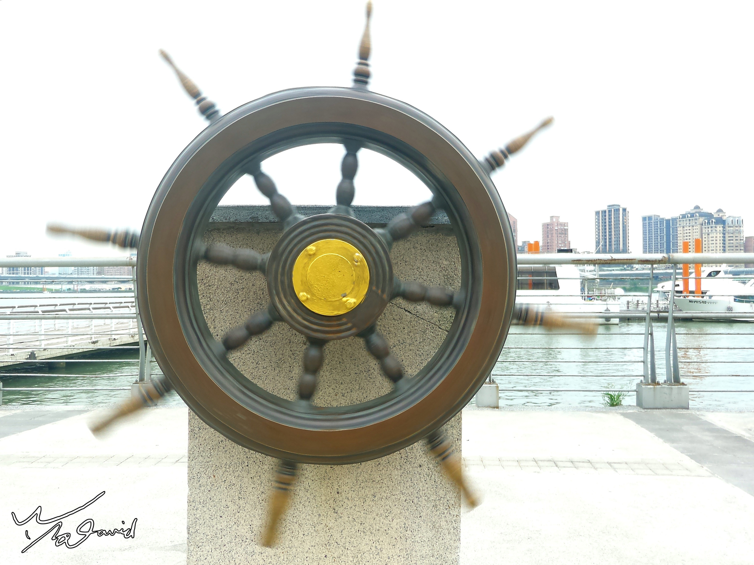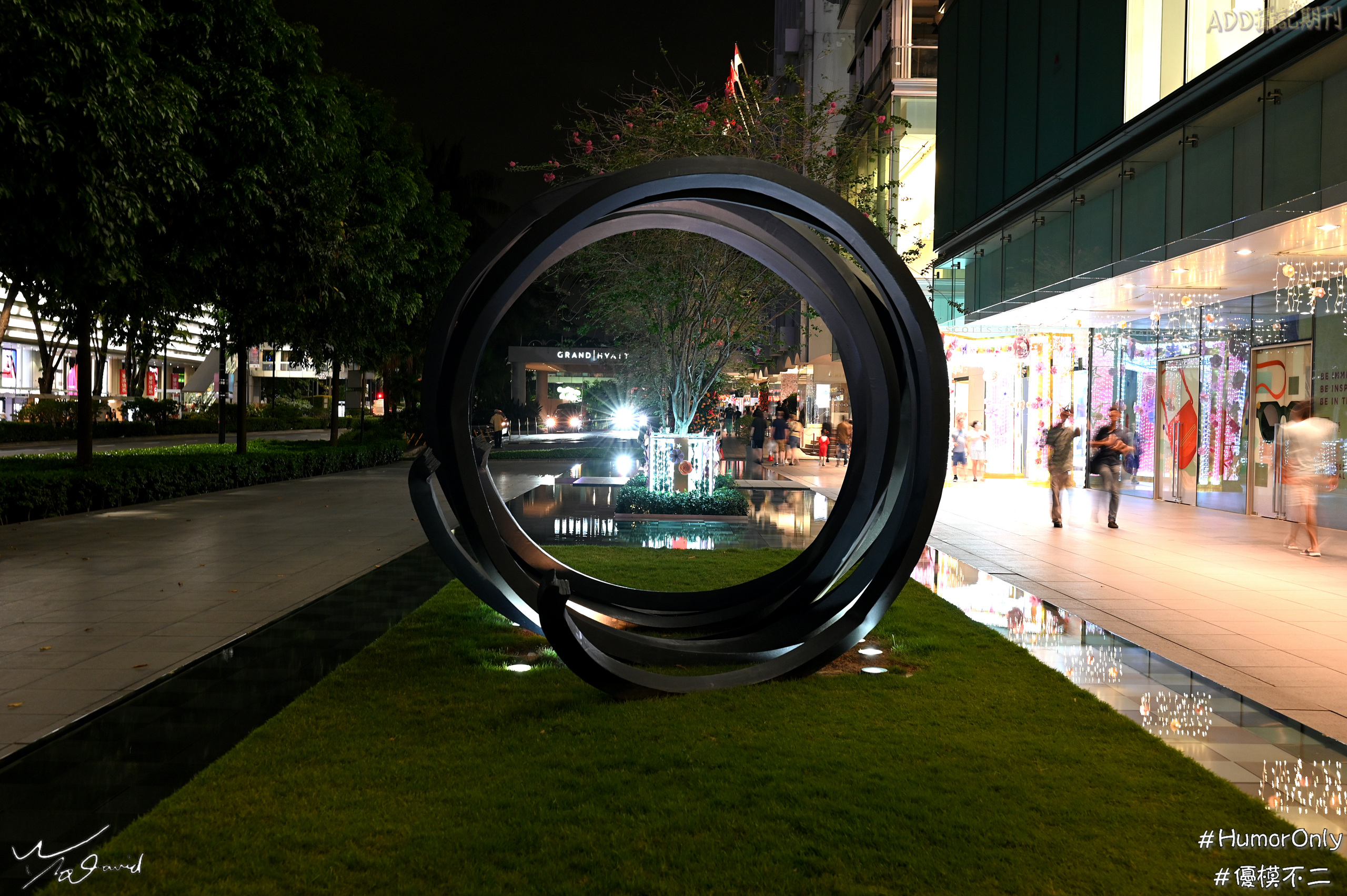 建築體除了配件是圓形可拍攝之外,還有裝飾用的建築附件,也可以當成主體拍攝,例如環狀式的裝飾,如下六張照片的上排左圖,是大稻埕河堤公園的物件,船舵控制輪,當時用手機拍下正在轉動的時刻。上排右側兩圖,則是在大佳河濱公園用手機拍攝環狀裝飾品。下排左上圖,是在新加坡烏節路旁拍攝(ISO-640,F/5.6,1/2秒,EV-0.3),環中的車燈處就是君悅酒店(2019年引發COVID-19國際傳播的一個重要點)。下排左下圖是在高雄駁二特區用手機拍攝,鐵製品結合成環狀體的裝置藝術品。下排右圖是在台中市議會旁的公園用手機拍攝,水平環狀網在太陽投射地上的影子,就是一個環狀圓形。