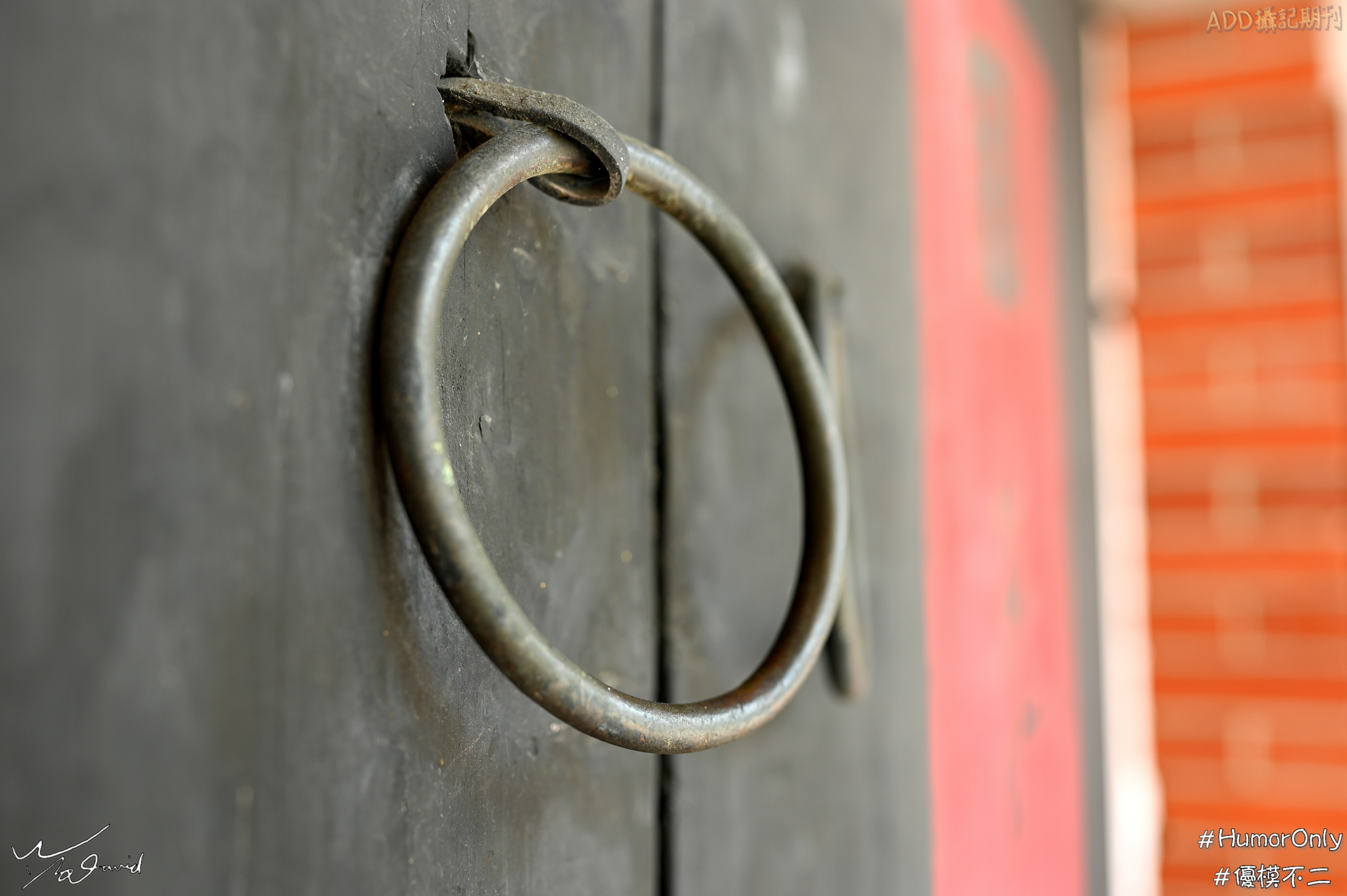 建築體,具有圓形配件的物件,也可以當成拍攝主體。下列四張照片,有兩種不同的元素,圓形門環(兩張)在蘆洲李氏古厝拍攝。另一種圓形孔透射是在中正紀念堂拍攝,利用這圓孔作為近景,孔洞作為描述場景特色的有限範圍,有聚焦的視覺效果。