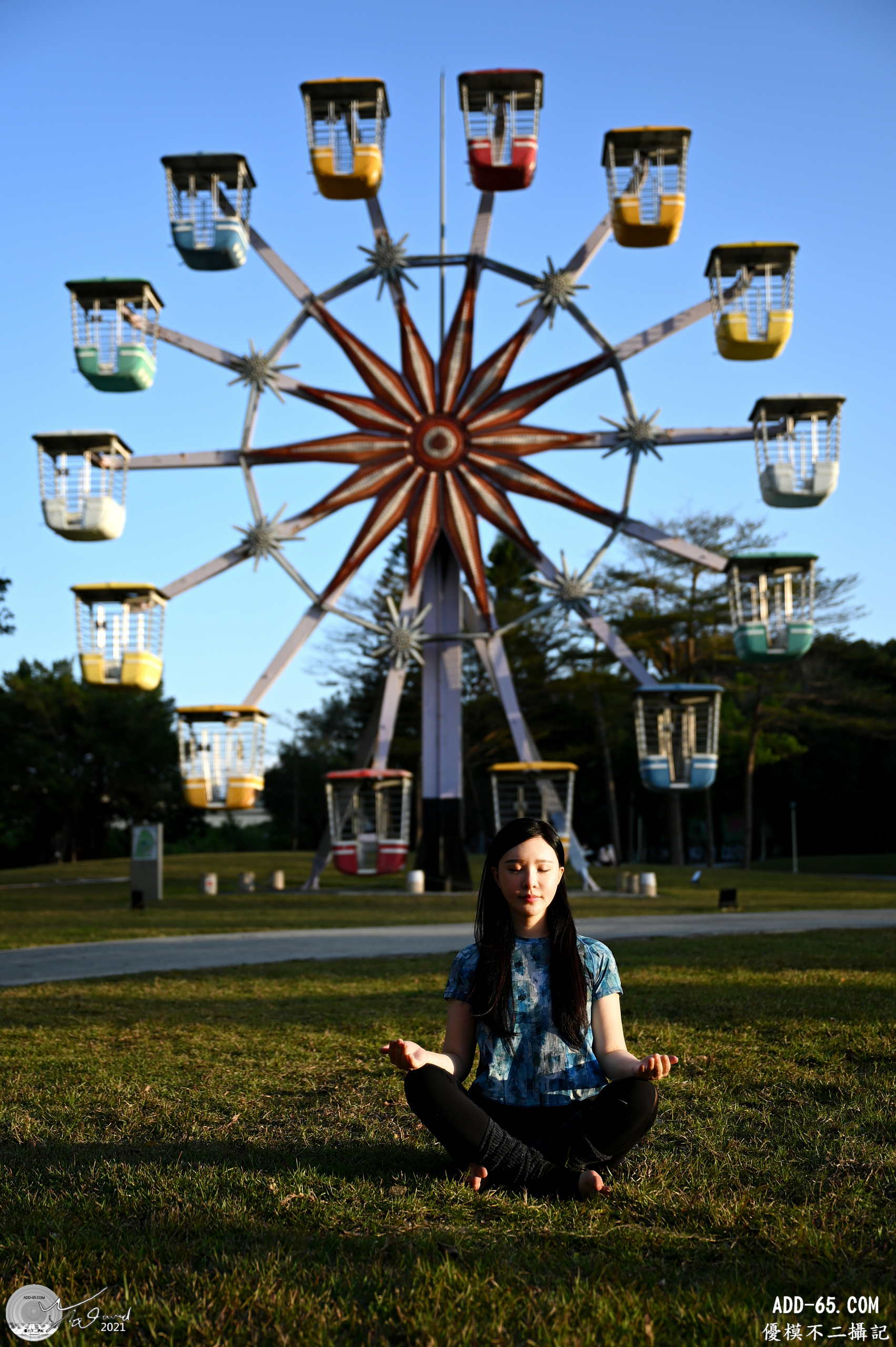 摩天輪有一也有小,下面兩圖是瑜伽老師外拍,在台北市舊兒童樂園的小型摩天輪前拍攝,把這摩天輪當成背景,配合打坐形成一種穩定圓滿的感受(ISO-100,F/2.8,1/1000秒,EV-1.0)。