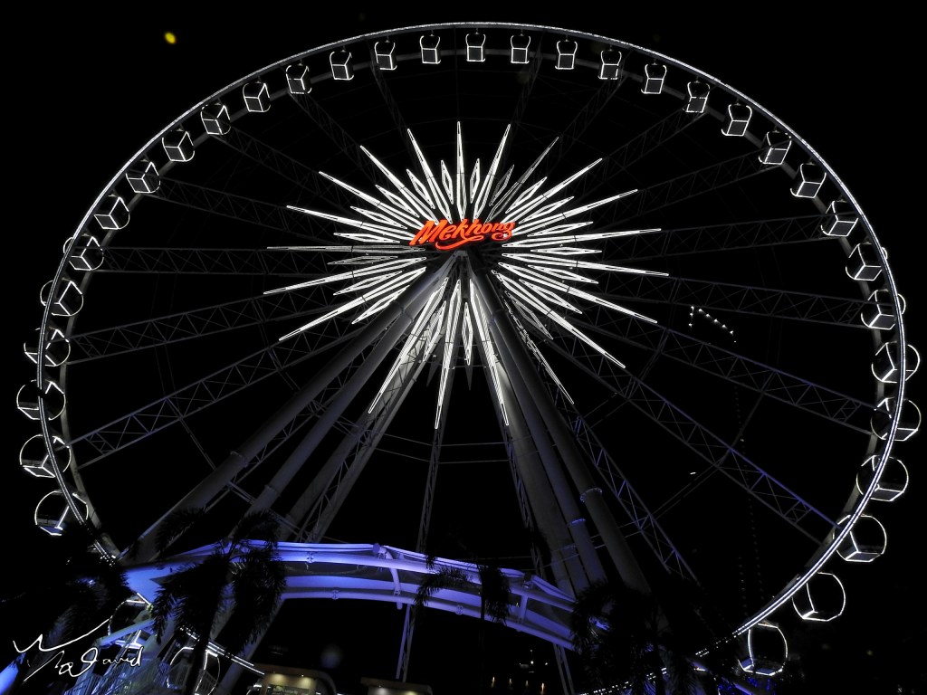 2017年6月在泰國Asiatique the Riverfront(河濱碼頭夜市)拍攝的摩天輪,一樣也是圓形造型,燈光的圖騰有其特色,更巧的是那一天月亮的位置,湊巧在摩天輪旁邊,一併入鏡(ISO-400,F/6.3,1/20秒,EV-1.0)。