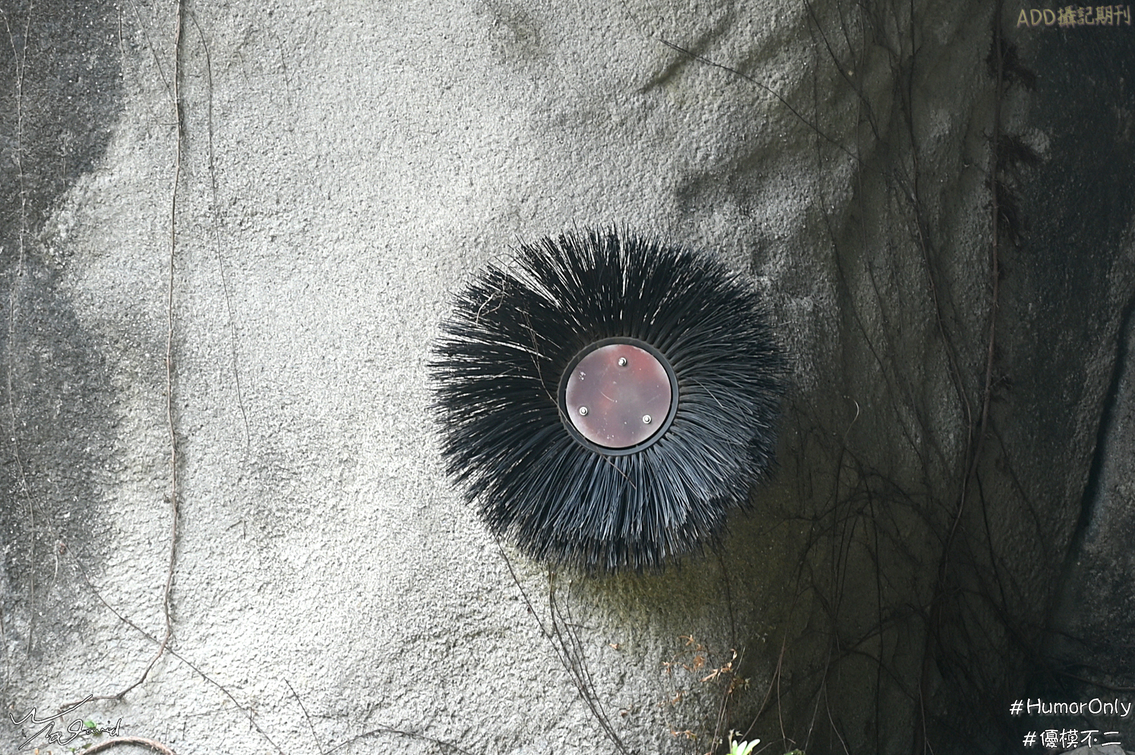 偶見的天空奇景,但也好像很常見,您可以留意看看。除了這種天空的圓形,我們再回到地面上來看看,還有那些平常容易忽略的圓形幾合。在木柵動物園裡,黑熊那一區,可以看到在假山壁上的大黑圓刷,第一次看到時,以為怎會在假山壁上裝飾鐵花,後來看到旁邊有說明,是方便熊掀背用。分別用Z6和P900各拍一張。左圖是Z6拍攝(ISO-125,F/4,1/30秒),右圖是P900拍攝(ISO-400,F/6.3,1/30秒)。看得出兩張的差異嗎?Z6的色彩較為飽滿,細節清楚,P900色彩較淡,對比較小,細節部分比較不明顯。