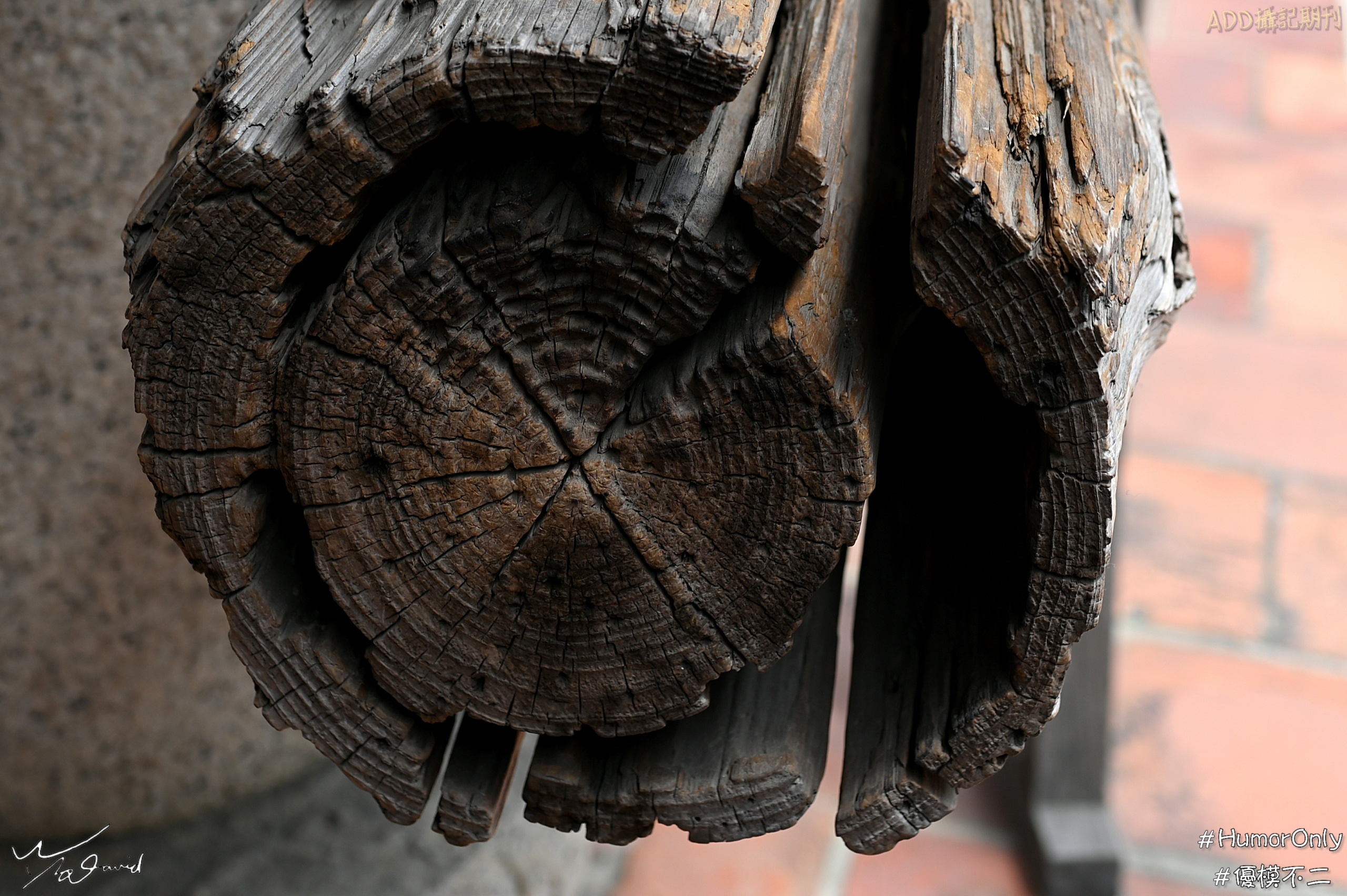 樹幹橫切面就是年輪,也是一種圓形的幾合圖形。左圖在台南赤崁樓拍到一根不小的枯木,這一張除了圓形的特徵之外,還有木質特徵的記錄,枯木的裂縫,訢說著它的歷史(ISO-100,F/4,1/250秒,EV-0.3)。右圖是在花蓮一家藝品店用手機拍攝用巨木當成桌子,數不清的年輪,年紀一定不小。