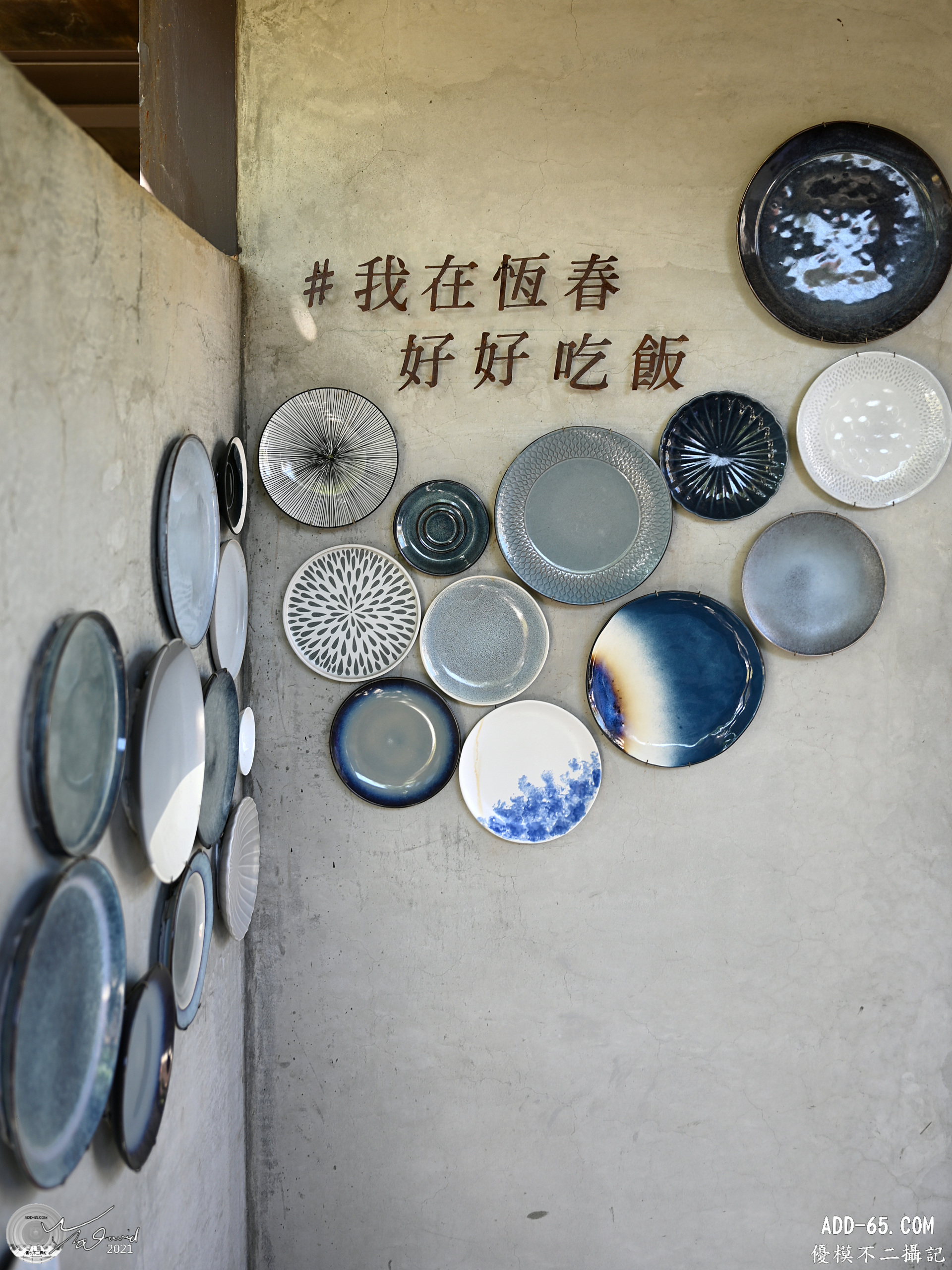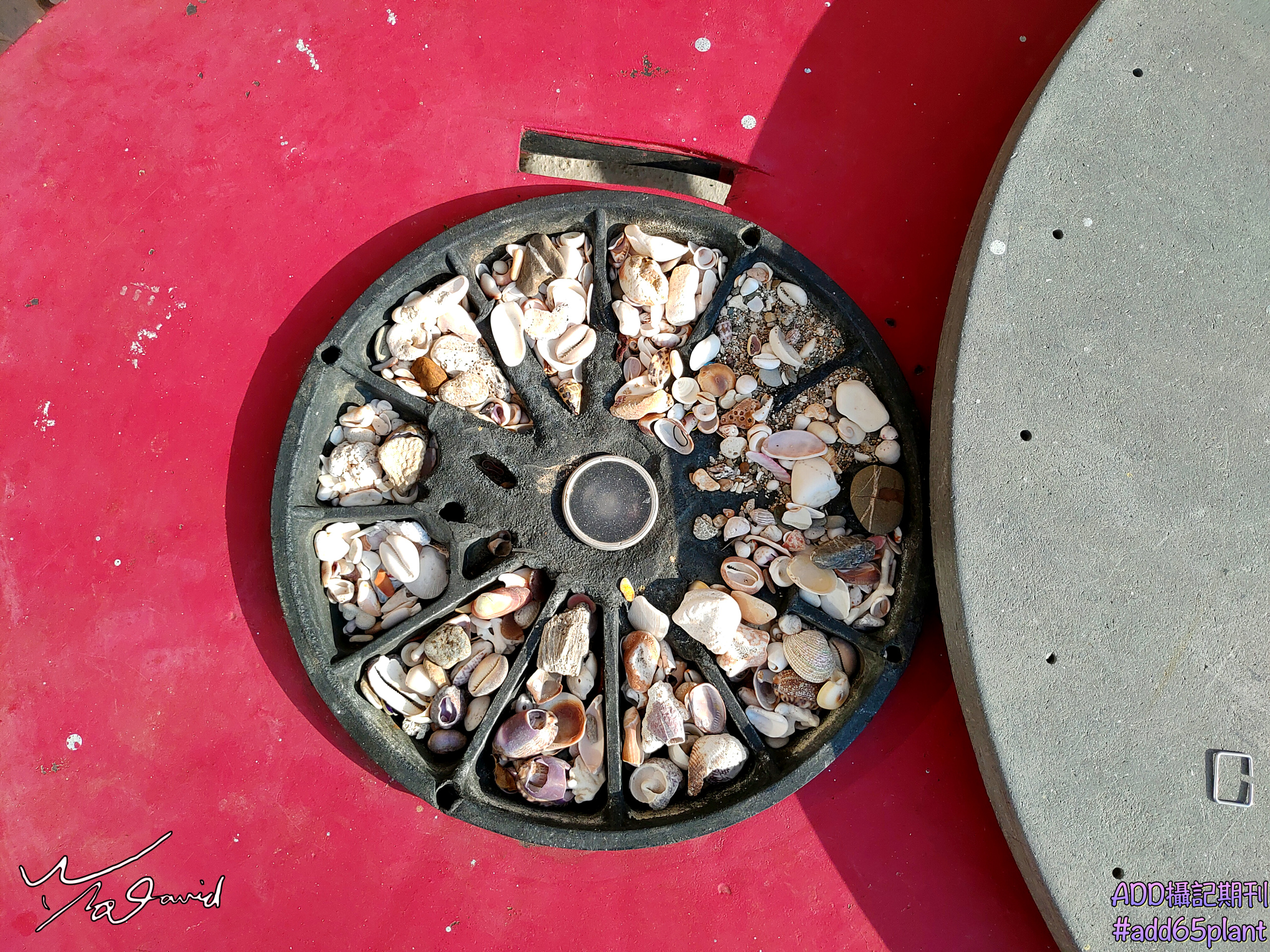 到墾丁外拍幾次,期間順便拍一些特色的照片,和圓形有關的如下兩圖,左圖是在恒春好好吃飯店家前拍攝,他們用一些特色圓餐盤當裝飾,和店名一起排列,非常有特色的設計(ISO-100,F/2.8,1/80秒,EV+0.3)。右圖則是在白沙灣附近的民宿拍攝時,發現一般吃飯的大圓桌,旋轉板移開後的結構,空洞處被補滿了貝殼,也算是很有特色,就隨手用手機拍了這張。