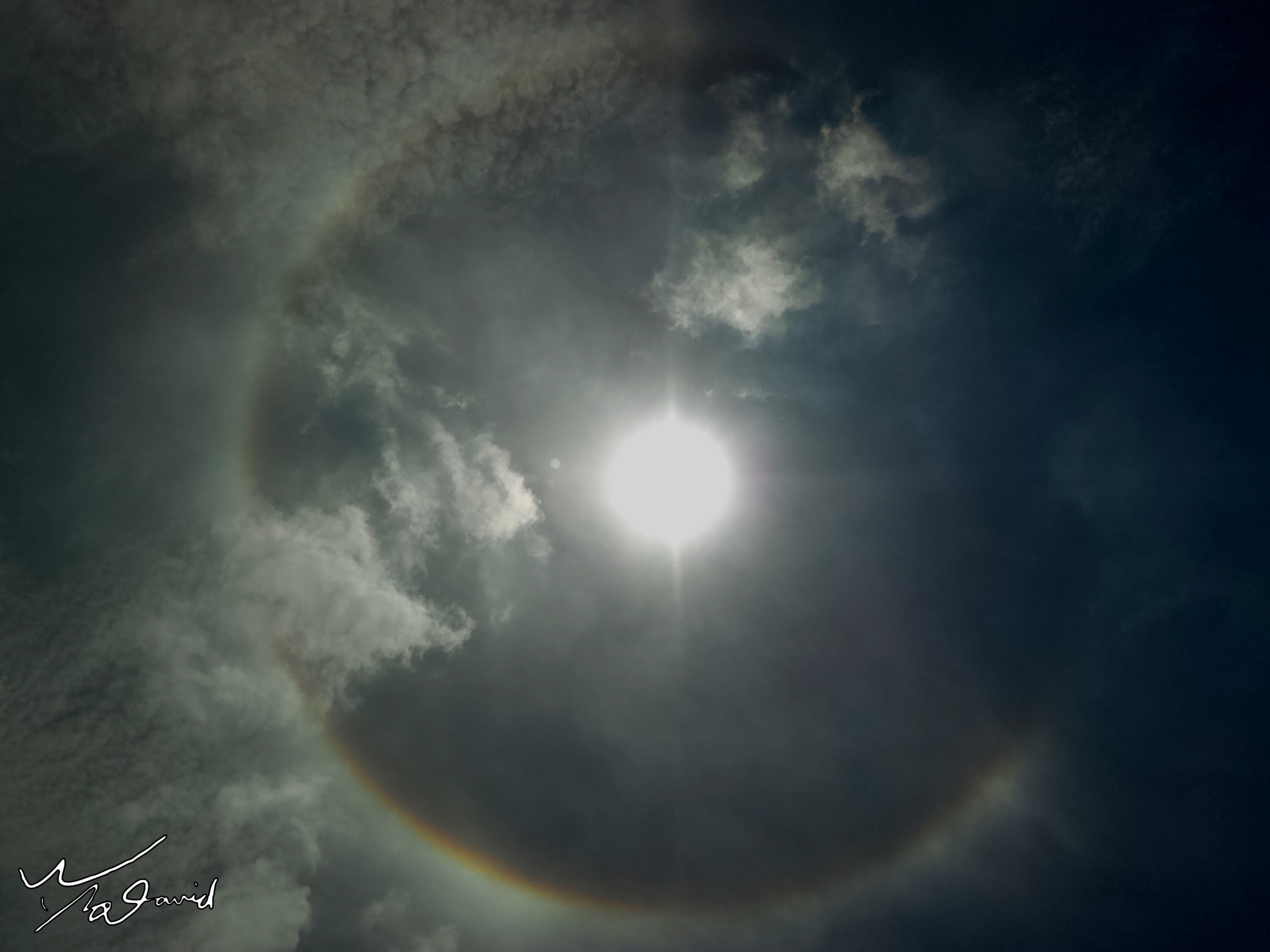 生活中還有許和圓形幾合圖形有關,都很適合作為拍攝的主題。偶爾可見到太陽伴著日暈在天空中,只要高空雲層厚度適合,在正午時分前後兩個小時,通常可以看到。只是對著大太陽拍攝要很小心,別傷了眼睛,壞了相機。主圖是2017年6月在泰國旅遊時拍攝(ISO-100,F/8,1/4000秒,EV-2.0),在使用P900拍攝之前,也用手機拍了一張如下左圖。兩張的差異在那裡?很明顯的是星芒表現性,還有就是日暈的清晰度。下右圖是在7月16日下午一點多用手機拍攝台北天空,也呈現淡淡的日暈。