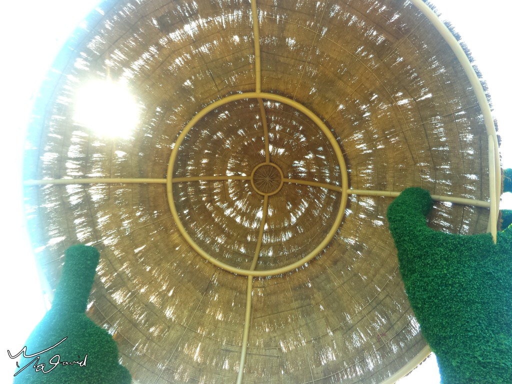 2018年造訪宜蘭的綠博,現場擺放著巨大的雕像,這雕像是用植物編織組合而成,拿著大斗笠的農夫,用手機在底下往上拍攝斗笠的底部,陽光透過斗笠的稻草間撒落,故意過曝的拍攝方式,這樣斗笠底部背光面才會清楚。