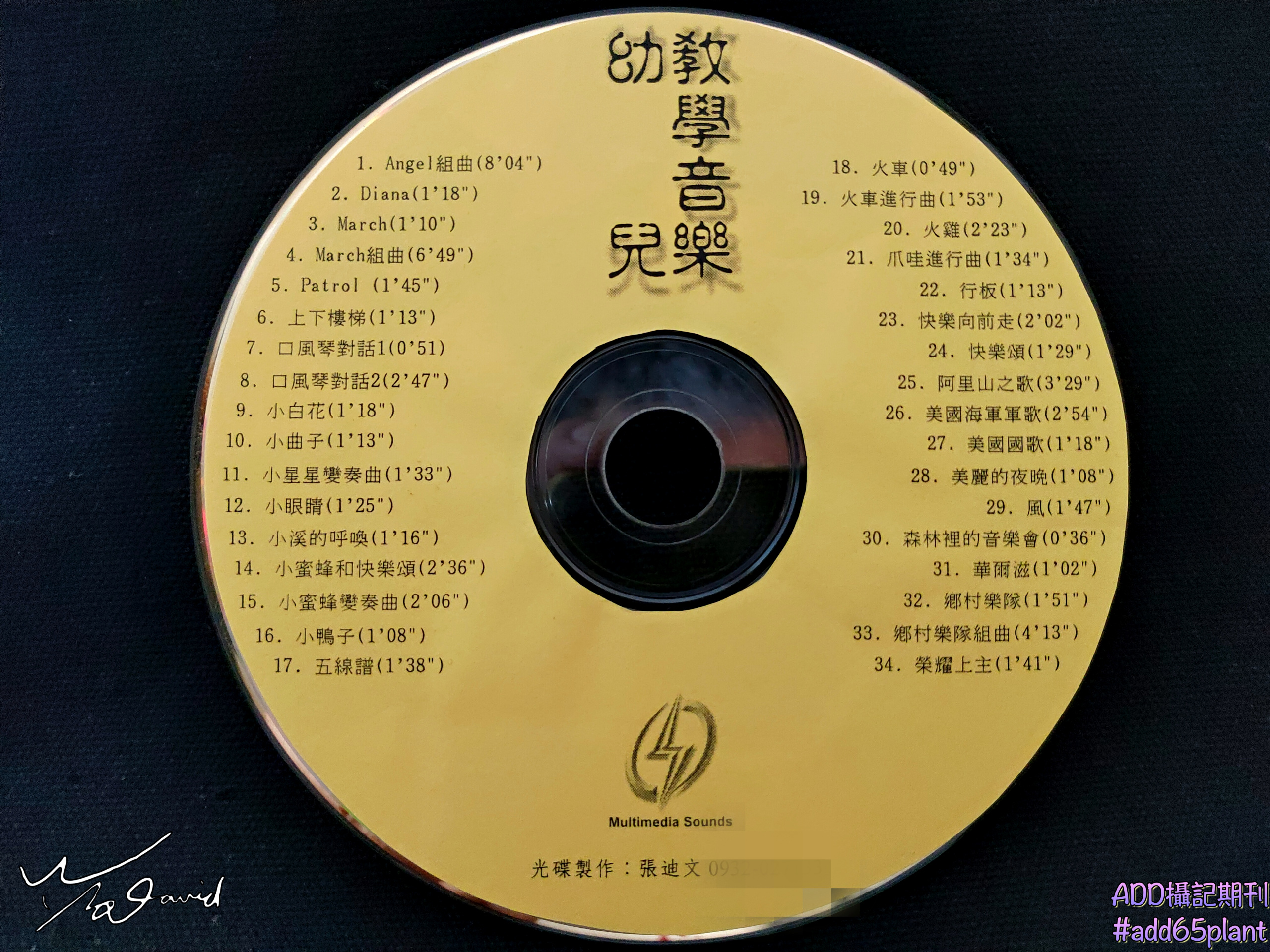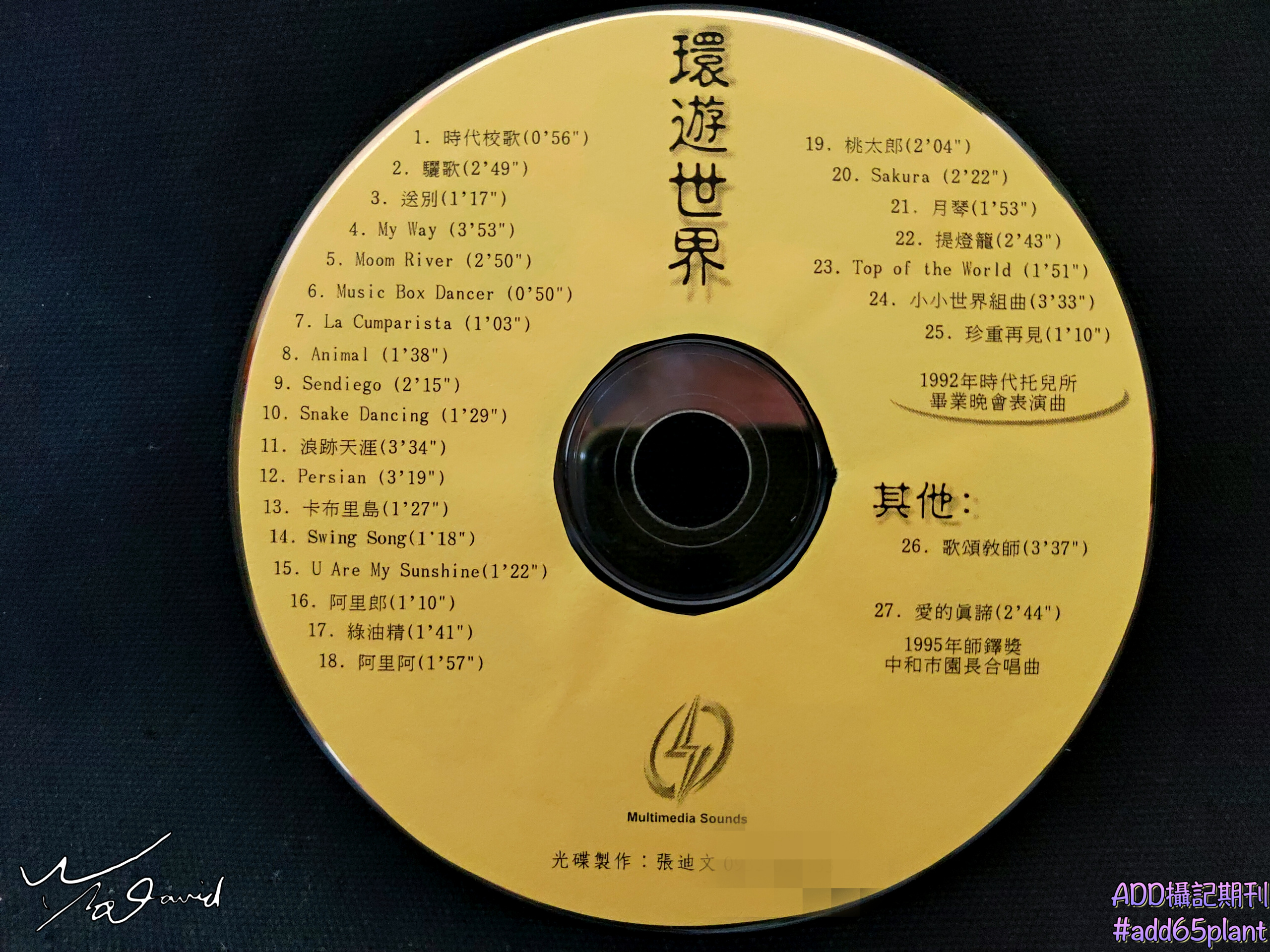 和大圓桌的形類似的物品,現在已經很少人在使用,光碟片。這兩張光碟片,都是在1998年由筆者自行製作,在幼稚園畢業典禮音樂課程表演節目的音樂集,用手機拍攝下來留作紀念。