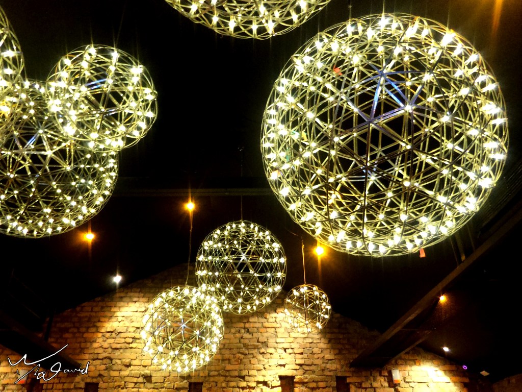 提到具有散奬或放射狀的燈具,在拍攝上也有不錯的視覺效果,下圖是在台北市市民大道一家已停業的餐廳拍攝內景,球狀鏤空造型的燈罩,分散在室內空間,用手機拍攝後,就像在星空下用餐的感覺。