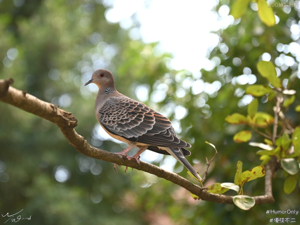 20201118在中和四號公園,也拍到樹枝上的金背鳩,下午1點半左右的陽光,透過葉片間照射,不會太強,背景散景後,和翅面圖騰呼應,它也很配合,讓筆者慢慢拍(ISO-320,F/2.8,1/320秒),它應該也是習慣被鏡頭看了吧!